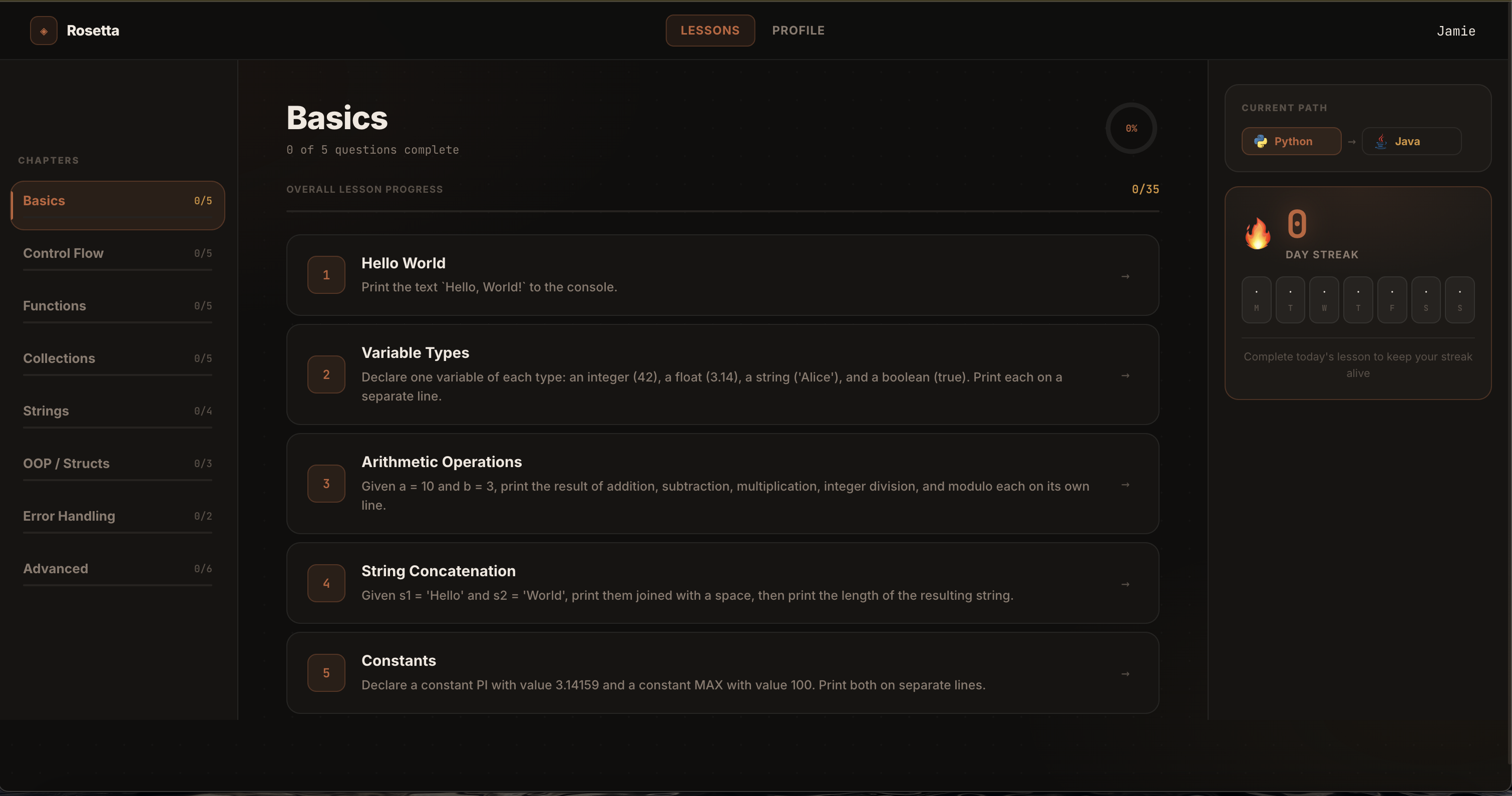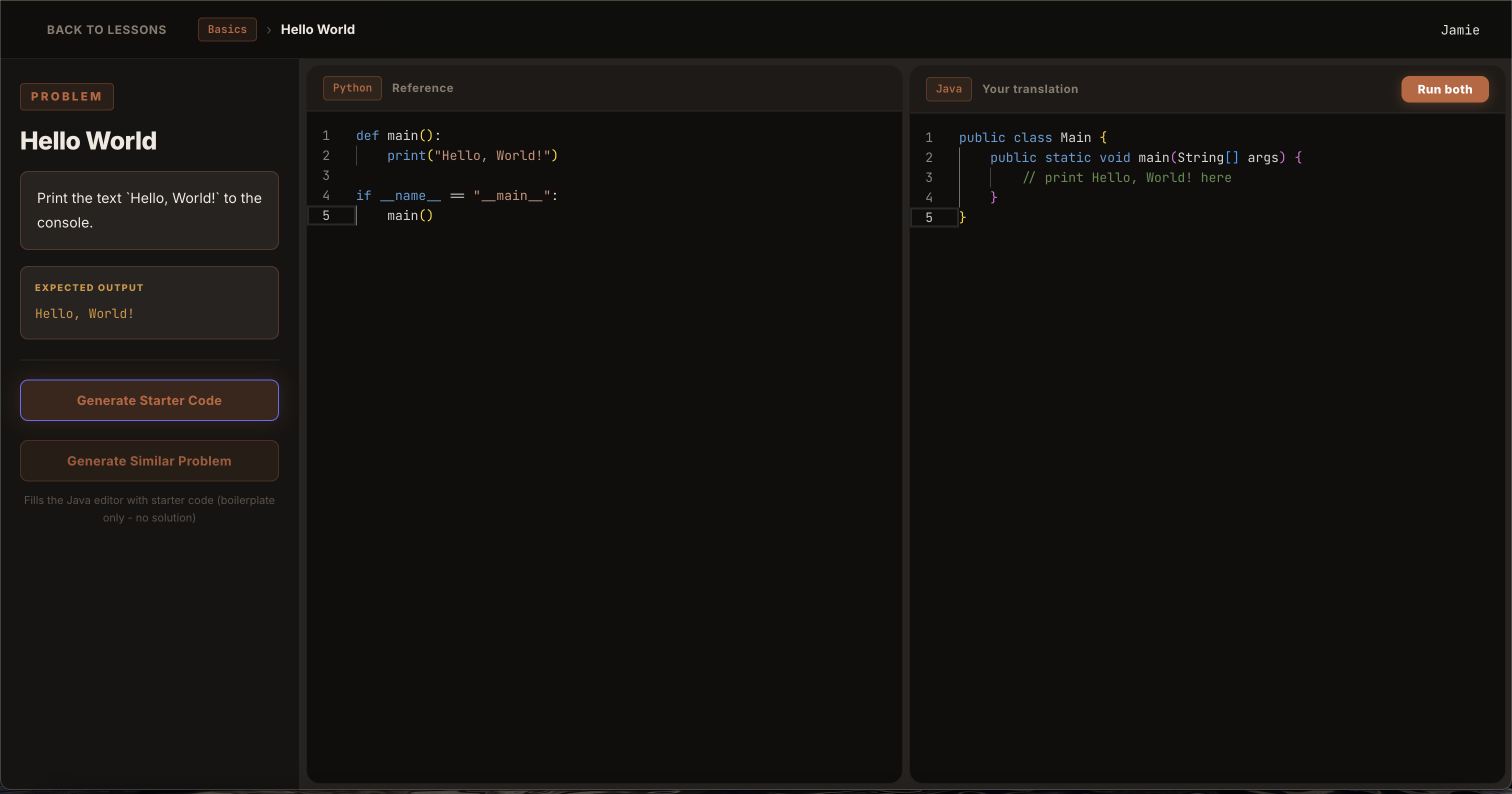 A user selects a language which they are familiar with and a language they want to learn. They are then taken through a list of questions which they can solve at their own pace. These questions start from the most basic concepts (print "Hello, World!") to some very advanced ones such as memoizations. While they are going through these questions, a solution to the question is provided in the user's known language. This allows them to more quickly understand differences in syntax as they are able to compare two languages and see the differences.
