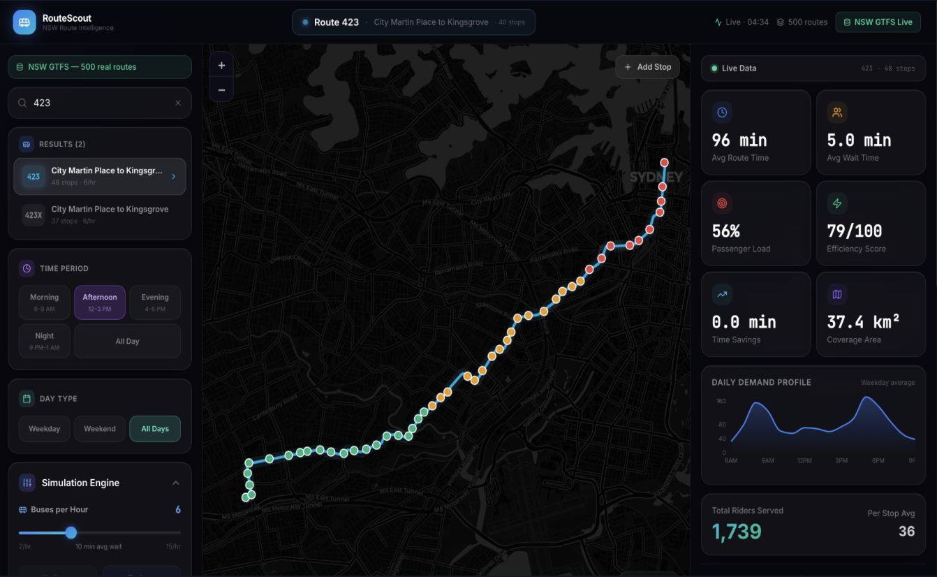The goal for RouteScout is to move from a "reactive" state to a "proactive" intelligence partner embedded within the Transport NSW planning process. We aim to further refine our AI to catch optimization opportunities that manual teams miss and expand our simulation engine to cover every metropolitan and regional corridor in the state. Our ultimate outcome is a smarter, more equitable NSW bus network delivered faster than ever before.