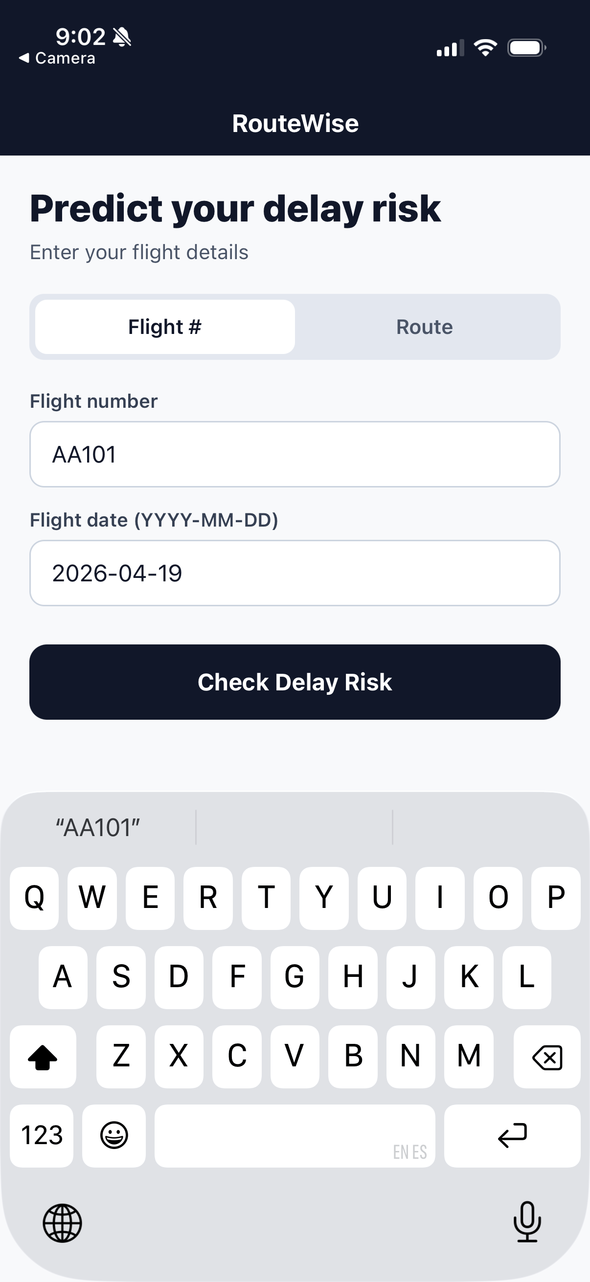 RouteWise is an AI-powered prediction app that forecasts the likelihood of a flight delay—and explains exactly why. By entering a flight number or route, users instantly receive: