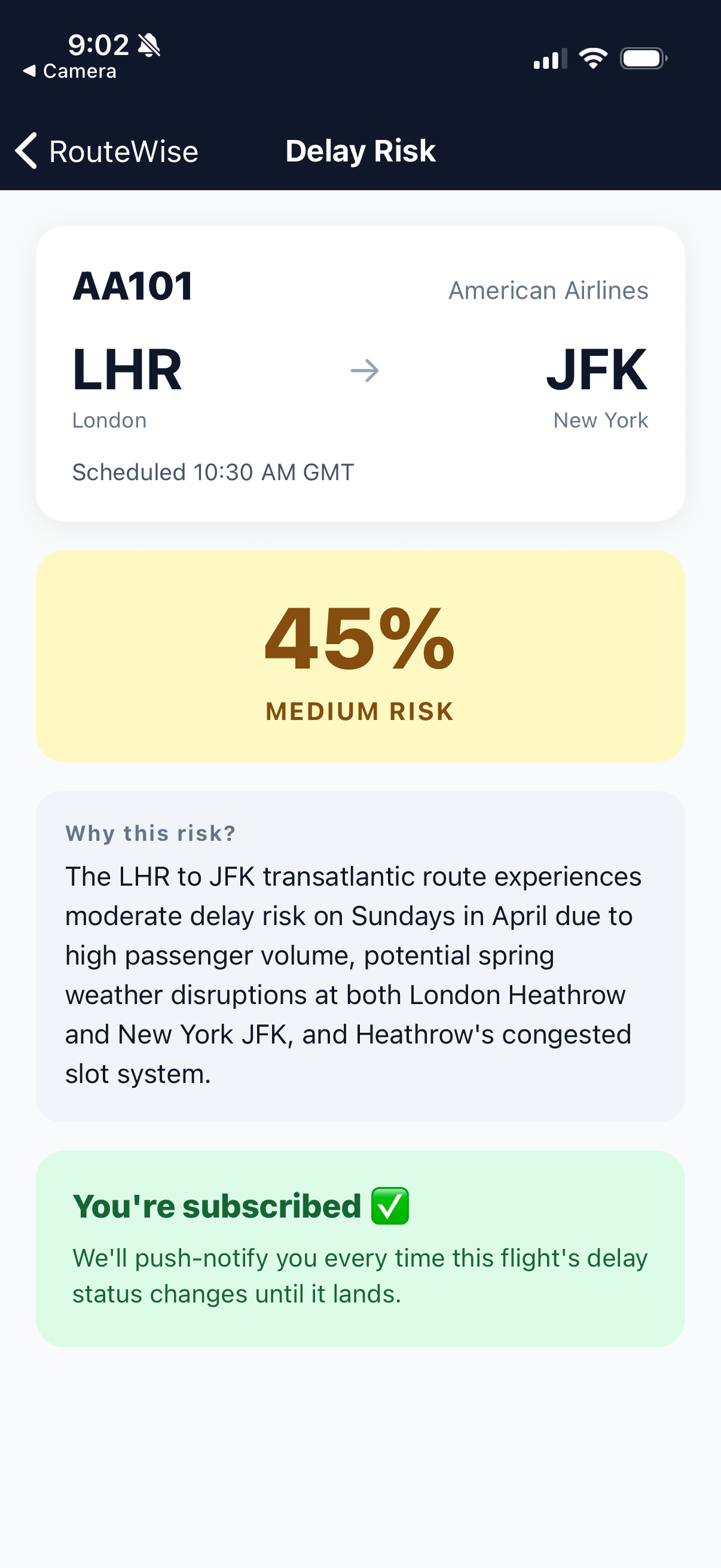 Flight delays cost US travelers over 33 million hours annually, yet the passenger experience remains stuck in the past: you usually only find out when you reach the gate or in emails that you don't see. RouteWise was built to shift travel from reactive to proactive, putting predictive intelligence in your pocket before you ever leave for the airport.