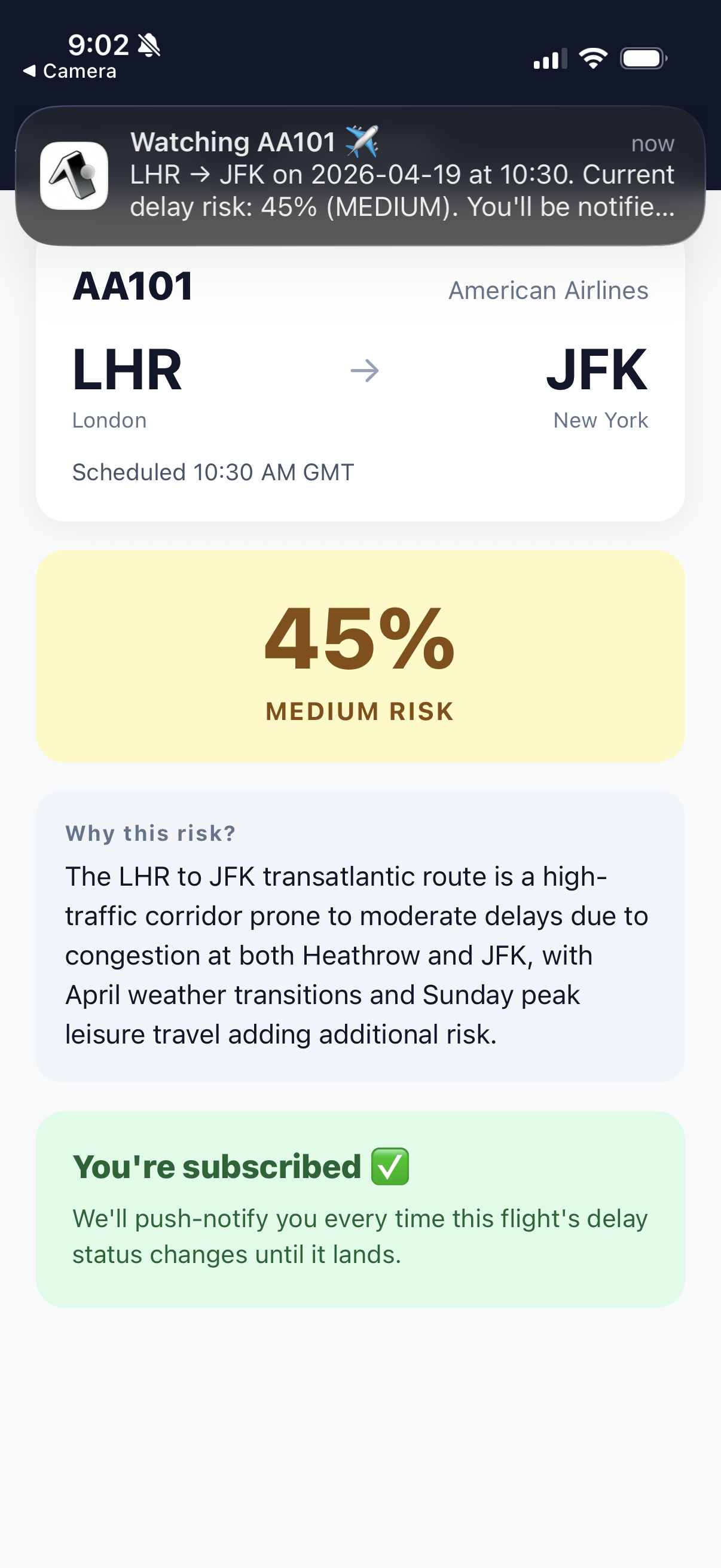 - Live Alerts: Background monitoring evaluates the flight every 15 minutes, triggering push notifications if the risk profile shifts prior to departure or if there is any delay made to the scheduled flight time.