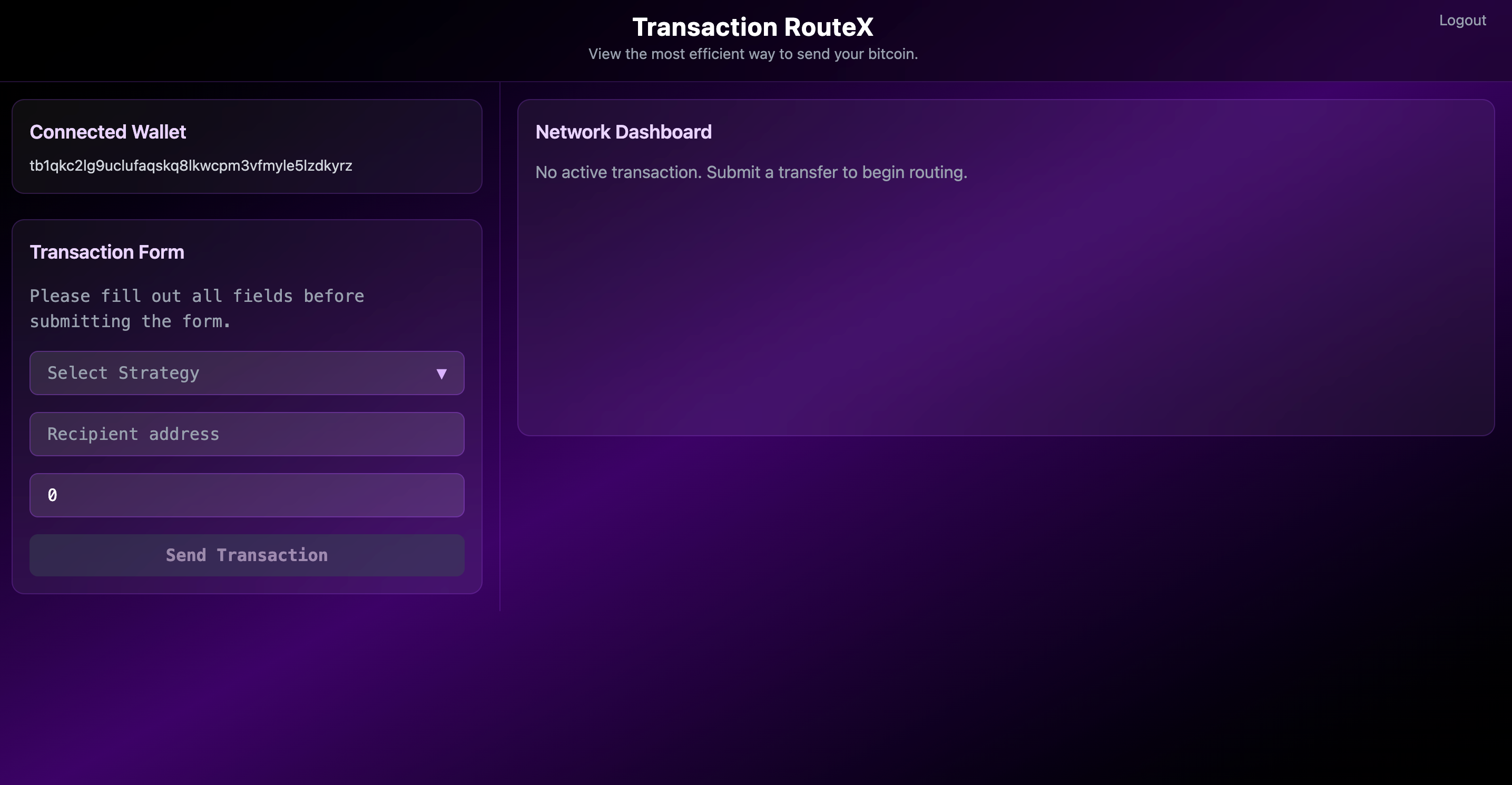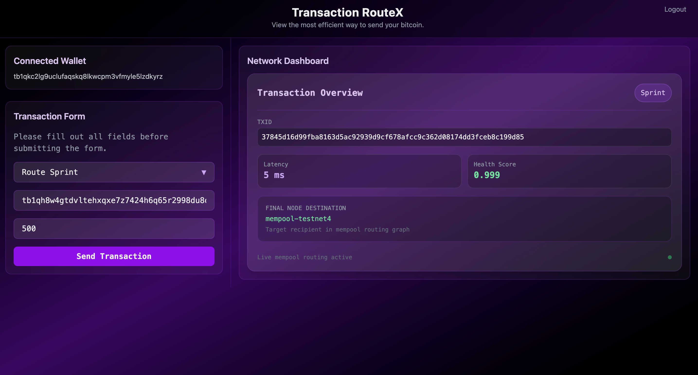 We built RouteX using a Node.js backend with an Express server and a real-time relay daemon that continuously evaluates network endpoint health. The system constructs and signs Bitcoin testnet transactions, then uses a custom scheduler to decide how to broadcast them across multiple nodes. We implemented: A wallet system using WIF keys UTXO fetching and transaction building/signing A relay daemon that tracks node performance and performs the scoring A multi-wave broadcast system to optimize propagation A React frontend for interacting with the system and visualizing jobs The backend integrates with mempool APIs for broadcasting and tracking transaction status.