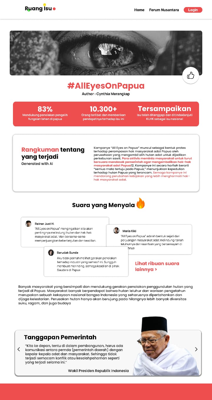 The More, The Stronger It all started when we saw the news about the #AllEyesOnPapua campaign. The Awyu tribe in Papua was protesting the change in forest land use. At first, the campaign seemed like a flop—no impact, and the government didn't seem to care. But then, everything changed. The campaign went viral on social media, gaining massive support. It also drew public attention to the fight of the Awyu tribe, which has been practically ignored for the last couple of years. This campaign gains around 3 million active user’s support by sharing related content all over the platform, gaining more and more attention. [1]