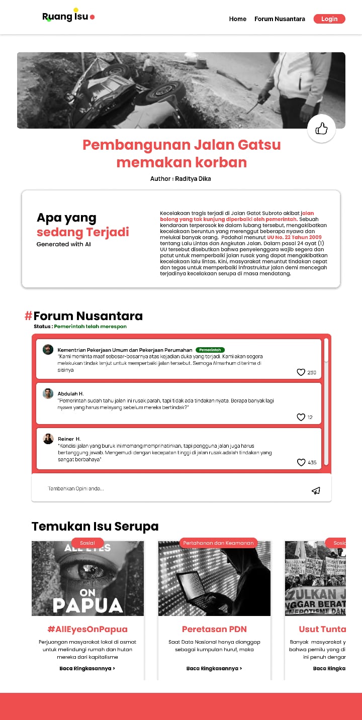 Ruang Isu empowers users to engage with government and community members by voicing their opinions and concerns on various topics such as infrastructure, health, education, nature conservation, economy, and other social issues. Additionally, users benefit from Artificial Intelligence (AI), which assists them in crafting their stories with enhanced background information and a more objective perspective. AI also eases readers by creating an objective summarize key points to various issues in Ruang Isu. Furthermore, users can explore existing issues and access comprehensive summaries, statistics, and government responses.