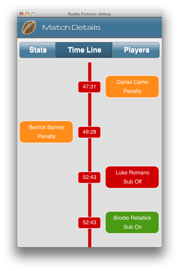 An Android app that shows fixtures from tournaments, including a time line with events such as Tries, Conversions, Penalties with different colors for faster reading.