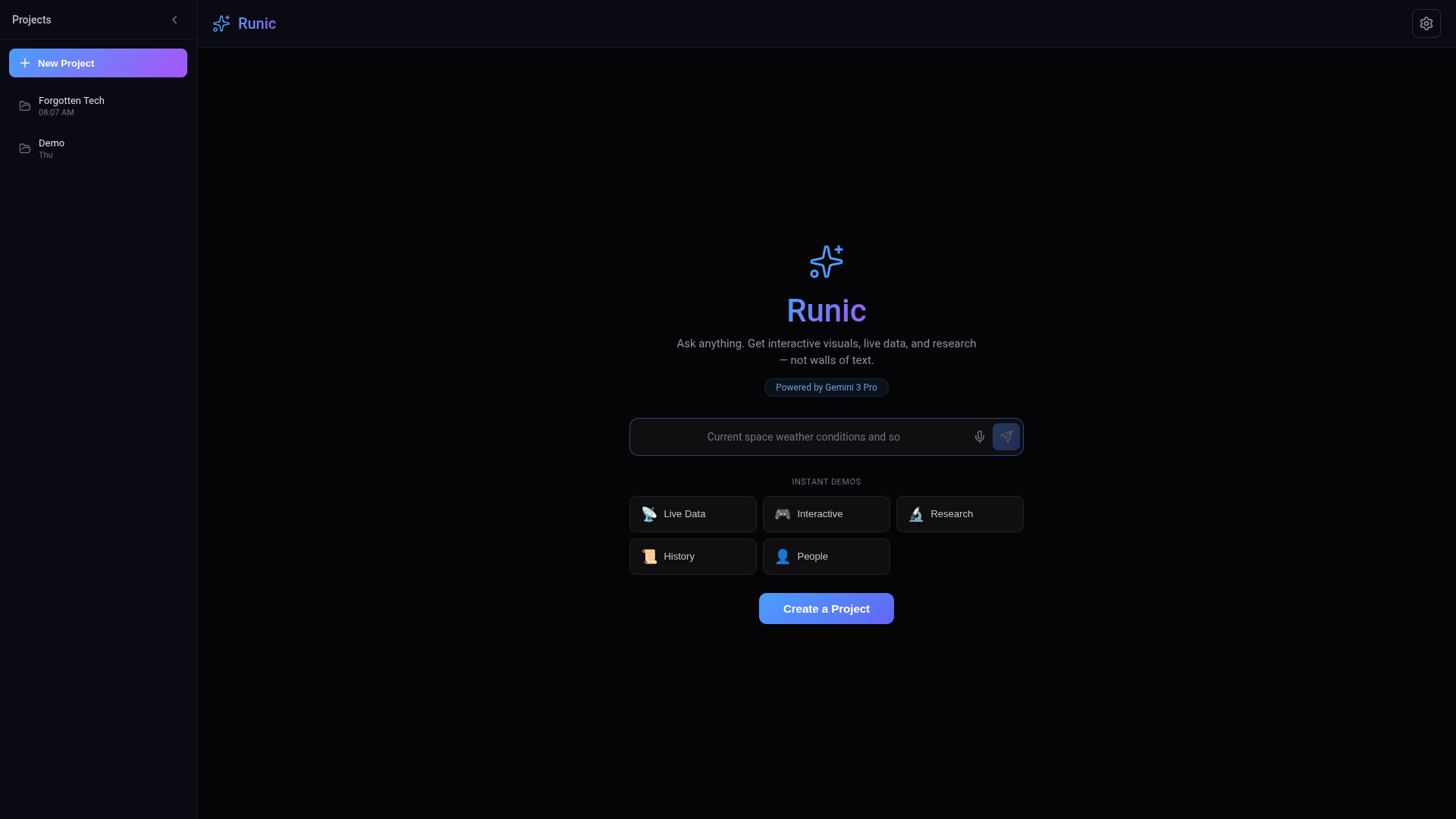 Runic is a high-performance research environment that transforms Gemini from a chatbot into a Digital Lab Assistant. It bridges the gap between raw information and verified insights by allowing users to harvest "Native Context" and trigger real-time data simulations.