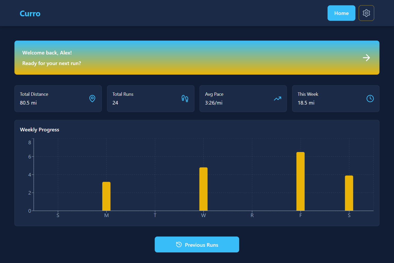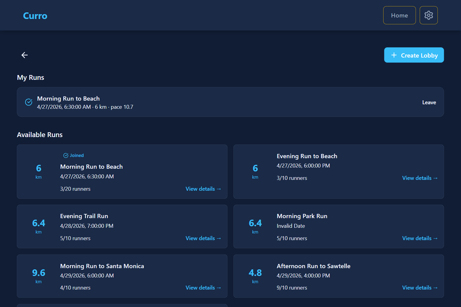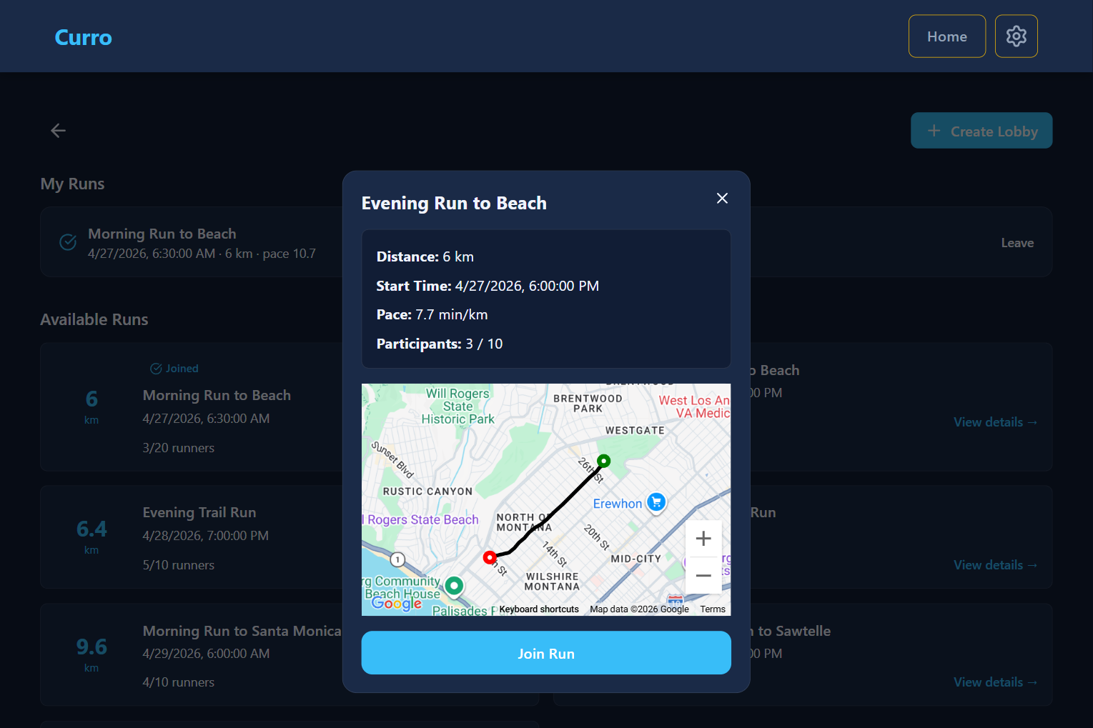 Running is better with others. Whether you strike up a long conversation or push your limits while running in silence, running with others is better. But running is different for everyone. People's pace, distance, availability, and goals vary greatly. It's often difficult for runners, especially for those just beginning, to find run groups suited for them. And that can make it harder to stay motivated and keep it running fun. Curro serves as a solution. Latin for "to run", Curro lets runners connect with others so they can run together. Users can join running lobbies, run groups with a set route, time, distance and pace, meeting other runners with similar abilities. Users can connect with others based on pace and preferences, making it easier to meet new runners, stay consistent, and stay connected. Running shouldn’t feel isolating—it should feel shared and fun.