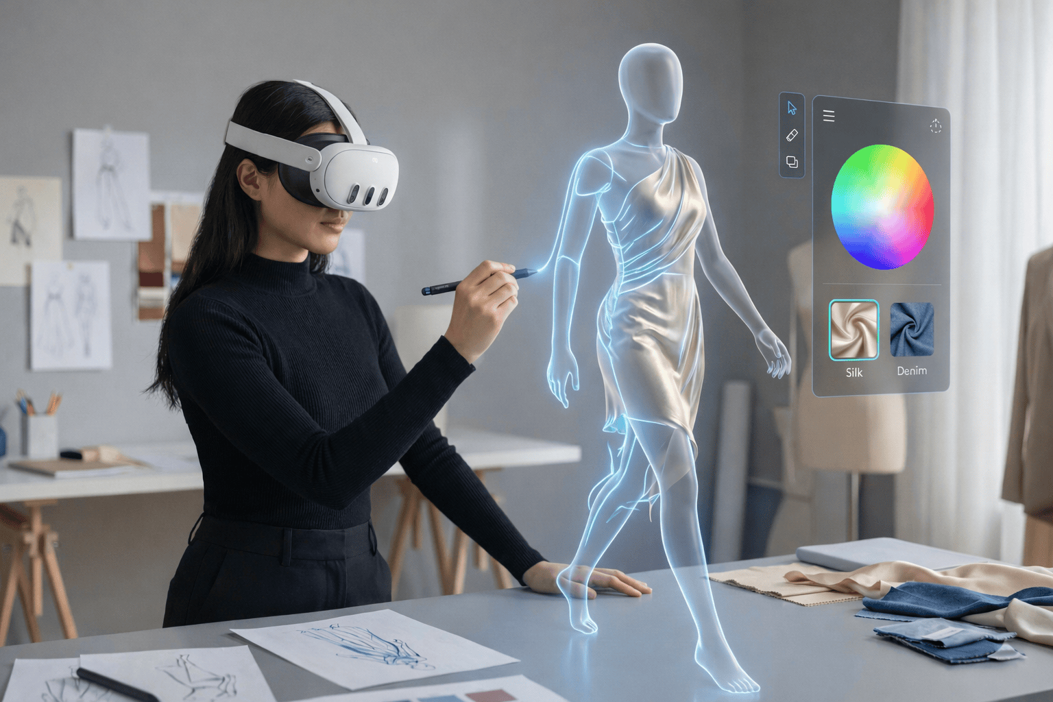 RunwayInk is a mixed reality app that changes how fashion designers work. Using the Logitech MX Ink pen, designers can draw, drape, and pin virtual fabrics right onto a life-sized 3D mannequin in their own room. Then, with a simple UI interaction, the mannequin actually walks forward, letting the designer see exactly how the clothes look and move in real life.