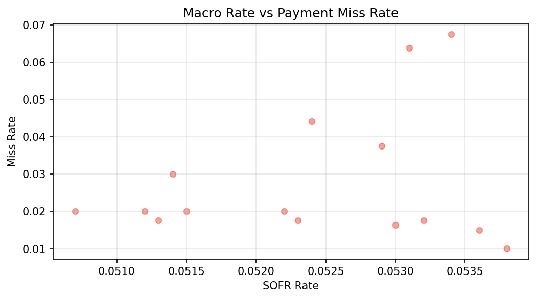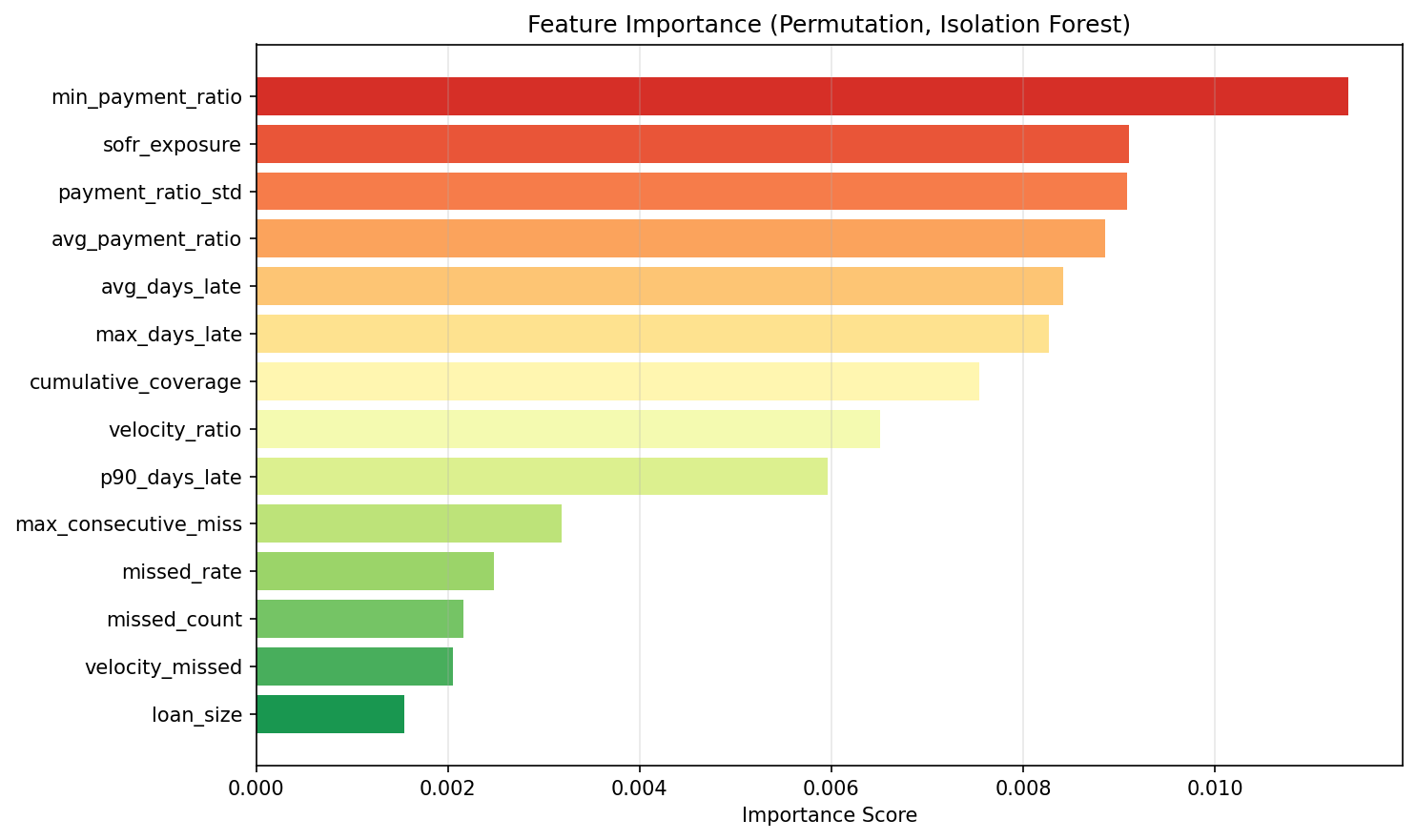 Predicts default probability A stacked ensemble (Random Forest, XGBoost, LightGBM) produces a robust probability-of-default score using engineered features such as: Missed and partial payment rates Days late and consecutive missed payments Payment ratio statistics (mean, variance, minimum) SOFR exposure and macro stress indicators Balance and leverage dynamics