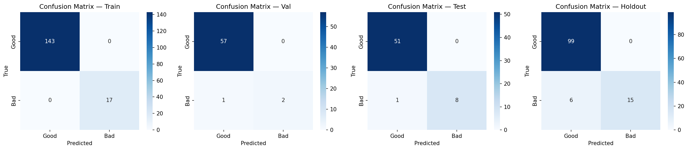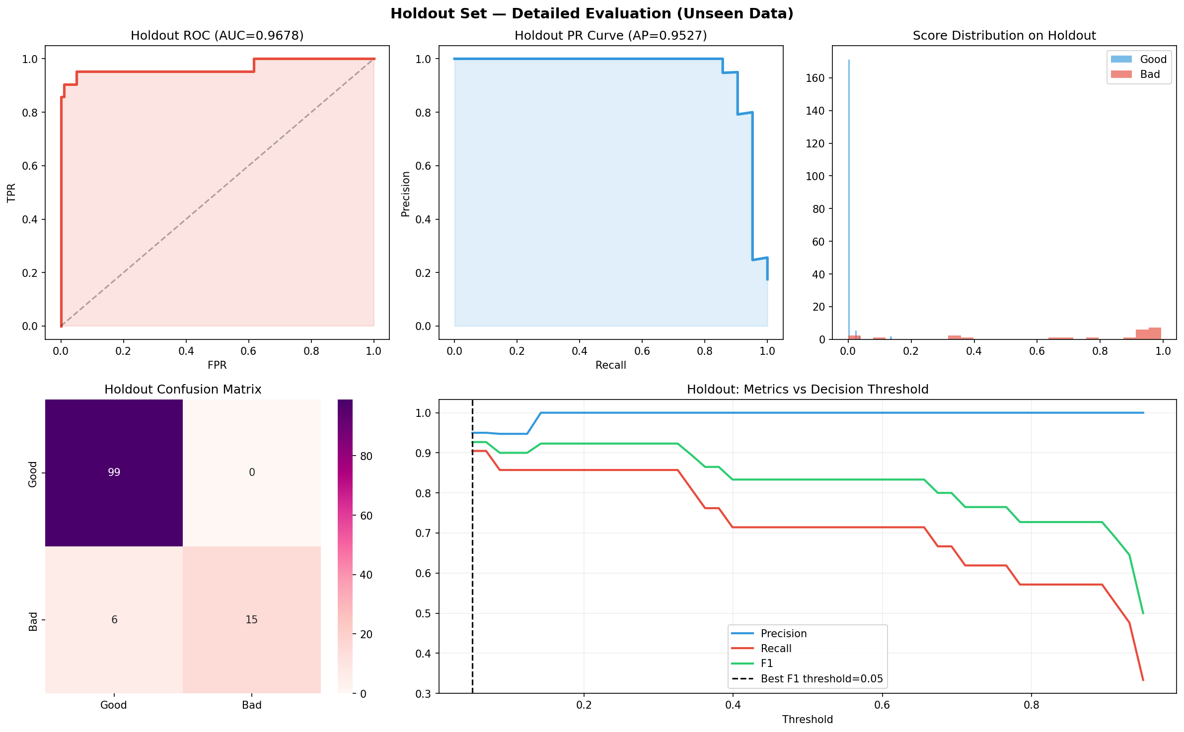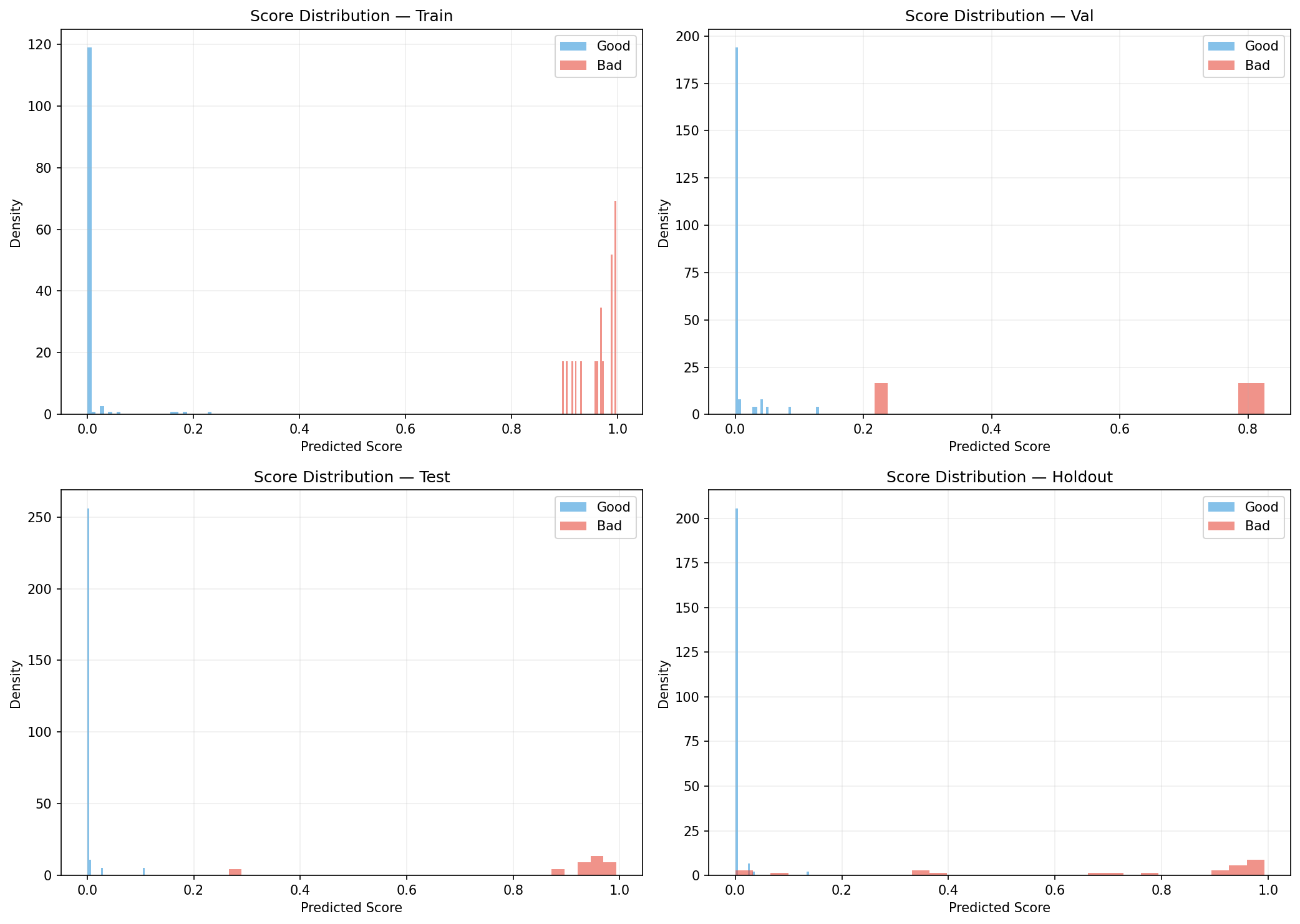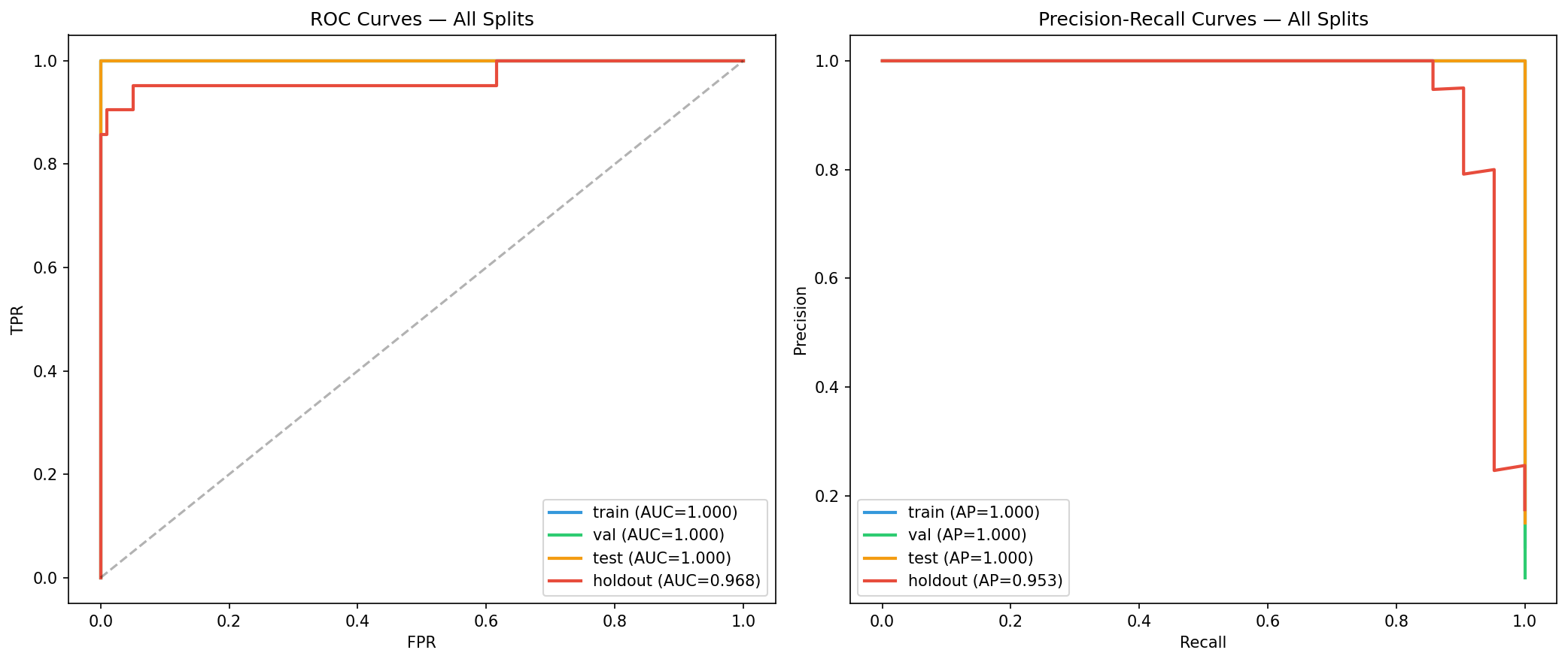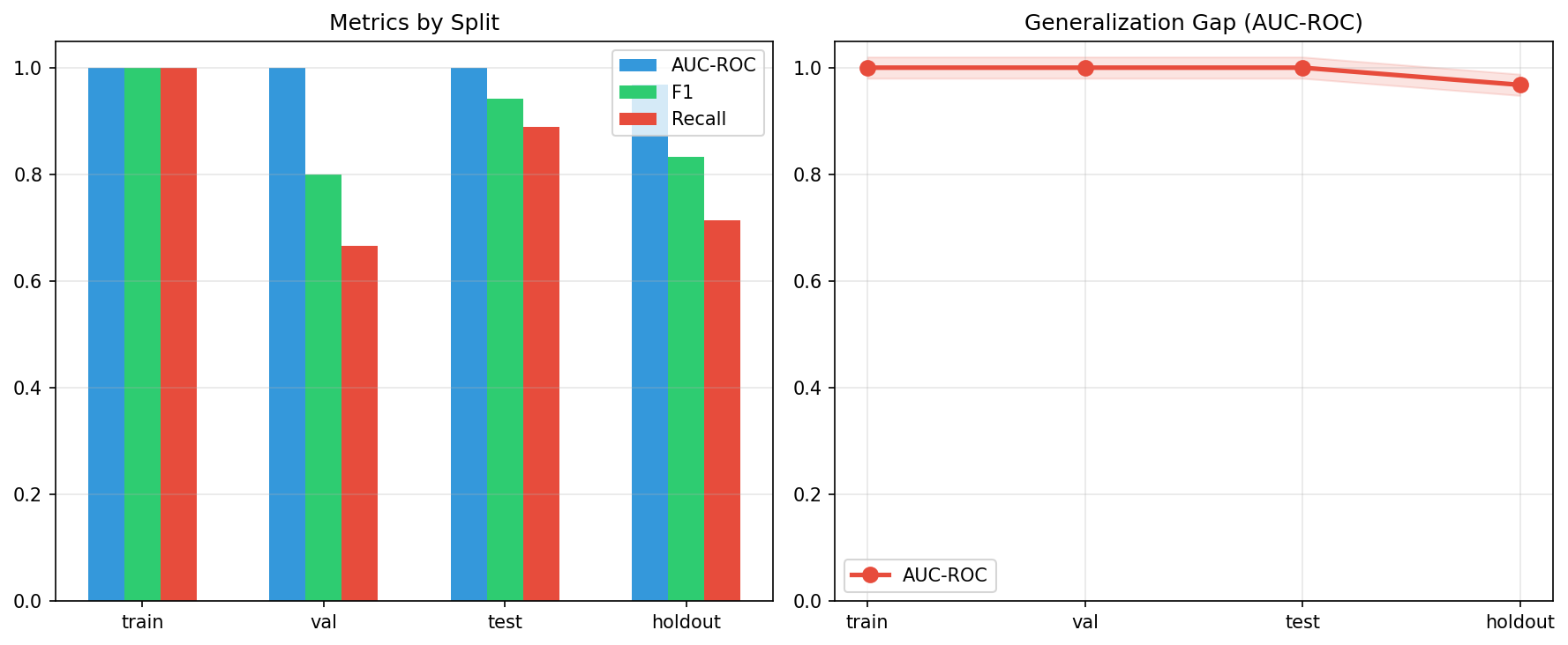 Validation Framework We enforced a strict four-way split: Train (40%) Validation (15%) Test (15%) Holdout (30%) This was paired with: Leakage detection checks Cross-metric evaluation (AUC, AP, F1) Overfitting diagnostics