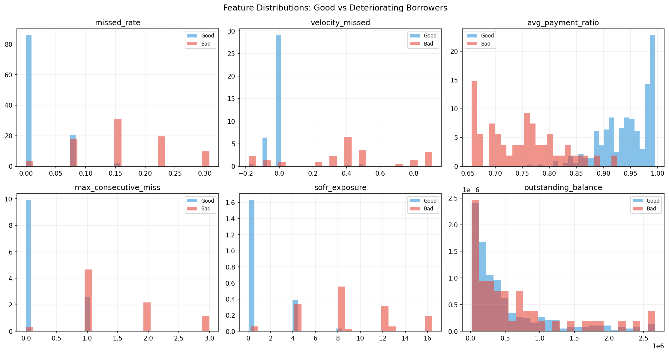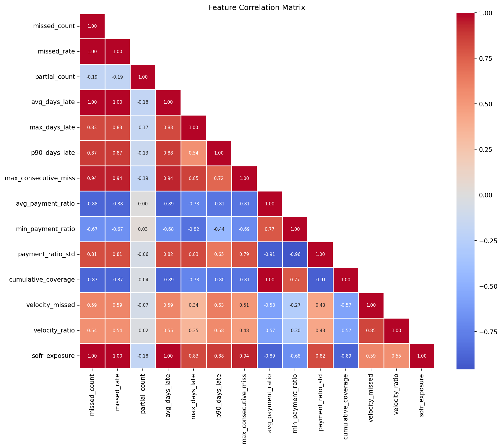 Feature Engineering We designed features specifically aligned with credit risk intuition: Behavioral: missed rate, partial payments, consecutive misses Temporal: rolling averages, volatility metrics, trend features Financial: outstanding balance, leverage ratio Macro-linked: SOFR exposure, macro stress rate Additionally, we constructed sequence windows (length = 12) for temporal modeling.