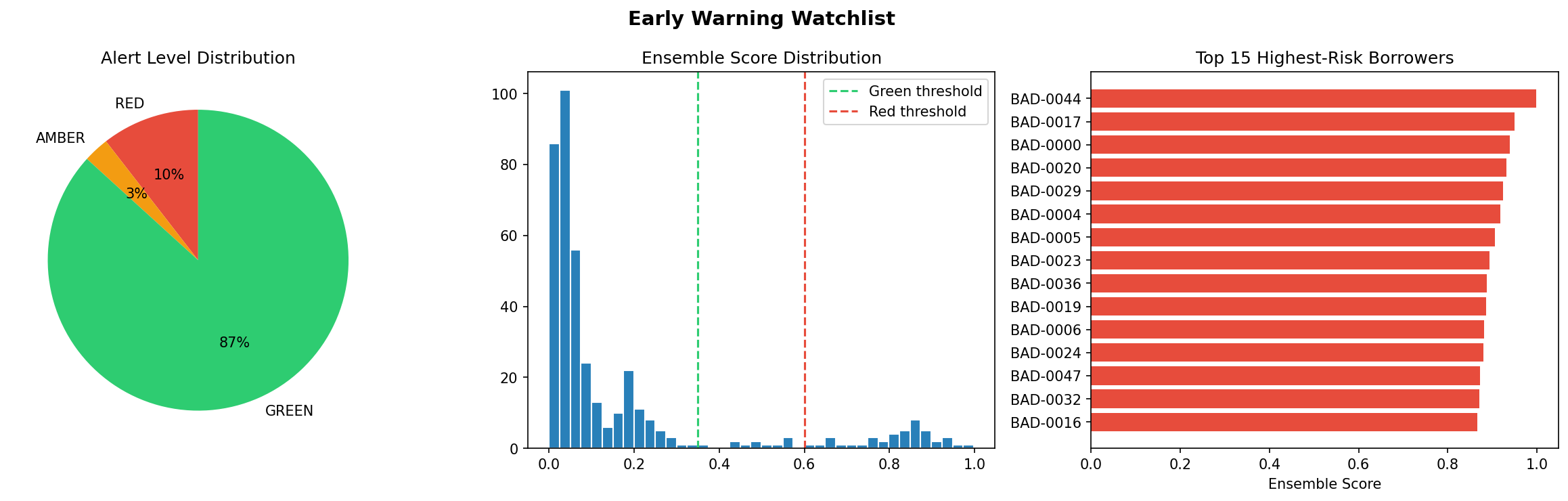 Output Layer The system translates model outputs into actionable intelligence: A ranked watchlist of borrowers Risk categorization: GREEN (stable), AMBER (watch), RED (high risk) Feature-driven explanations (via importance metrics / SHAP) AI-powered query interface for natural language exploration This bridges the gap between model output and decision-making, which is often where ML systems fail in practice.