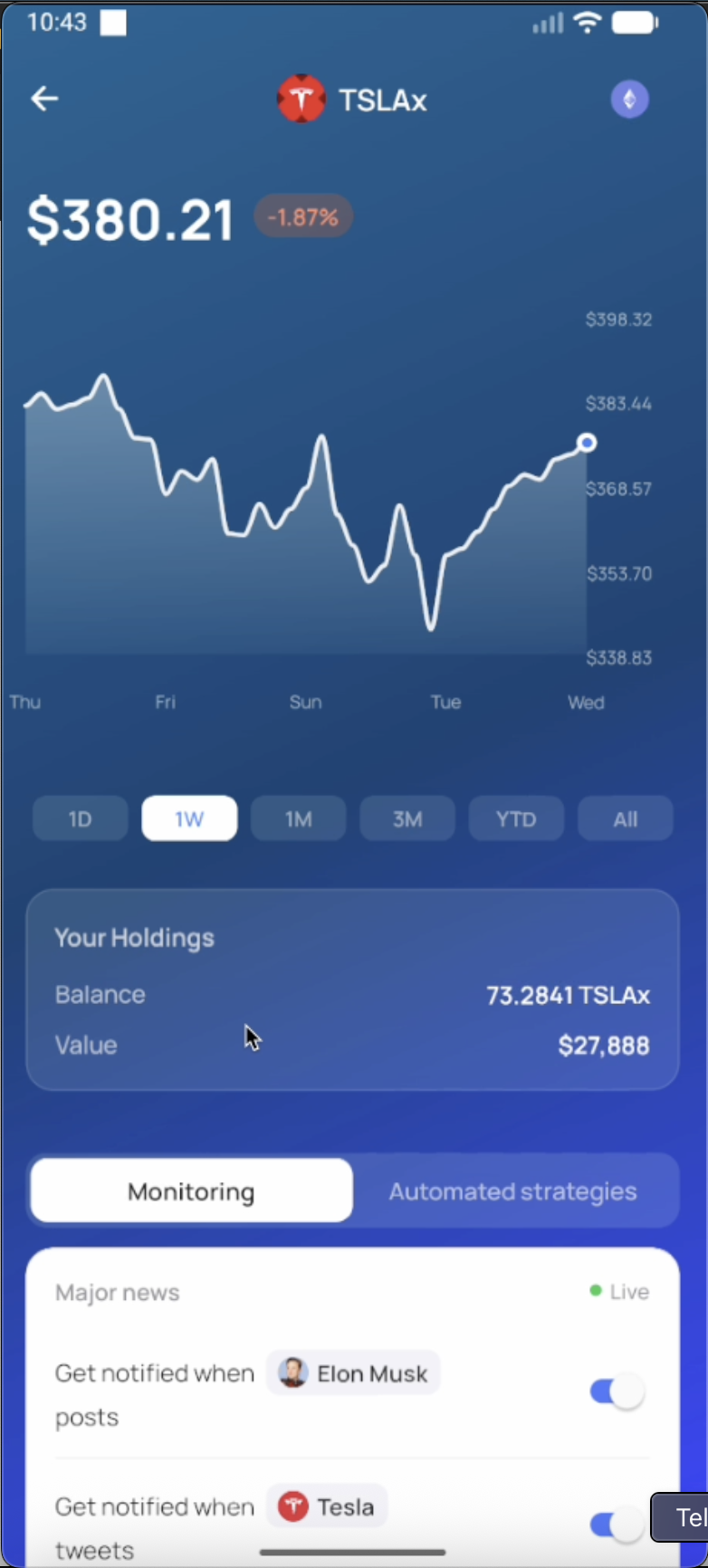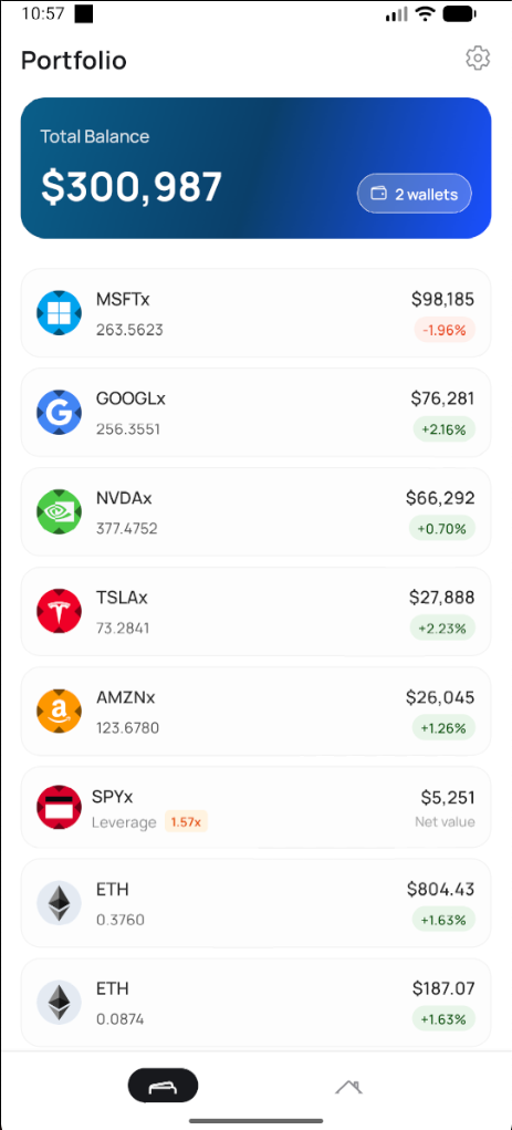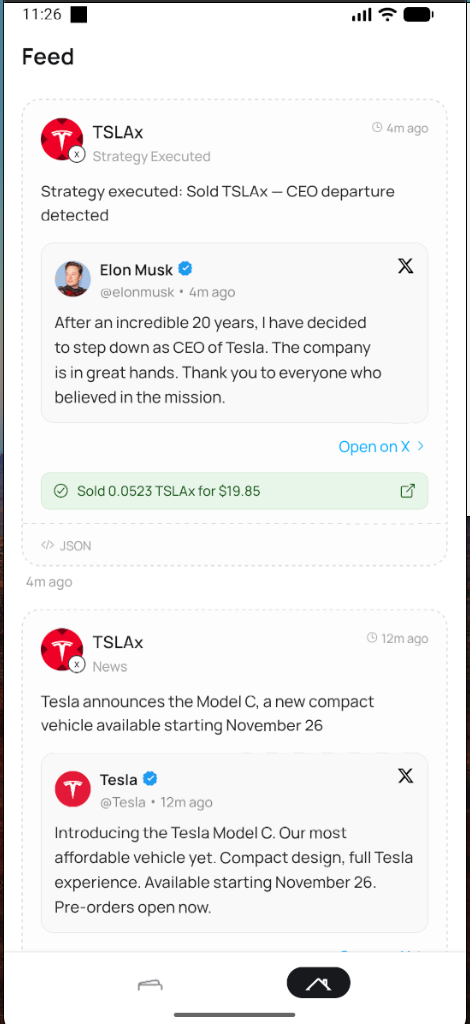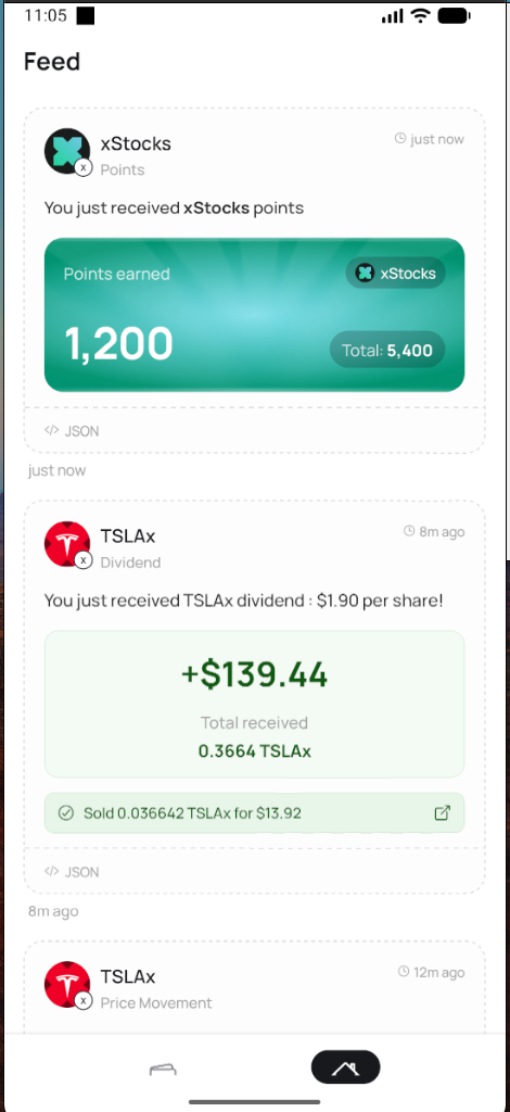- Mobile app (React Native) with a portfolio view showing all xStocks positions and a feed of alerts