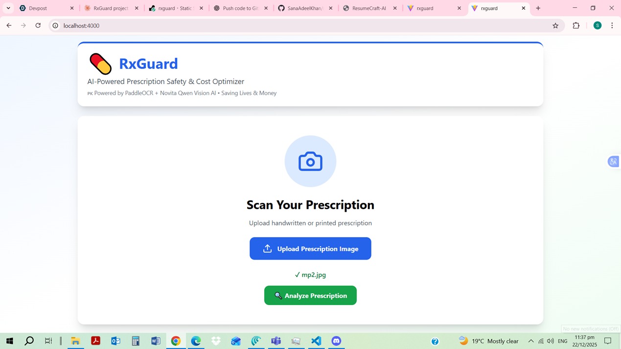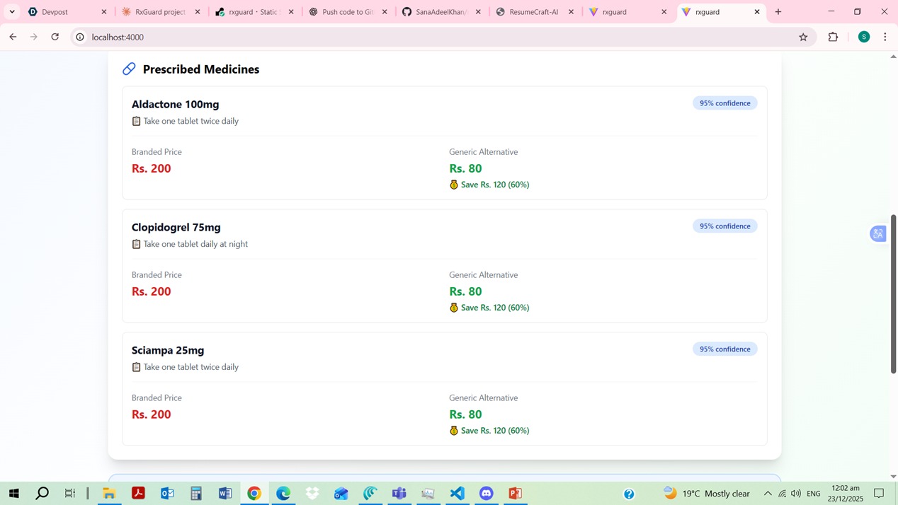 Pakistan faces a critical healthcare crisis: doctors' illegible handwriting causes 7,000+ annual medication errors, while patients pay 60-80% more for branded medicines. We built RxGuard to solve both problems.