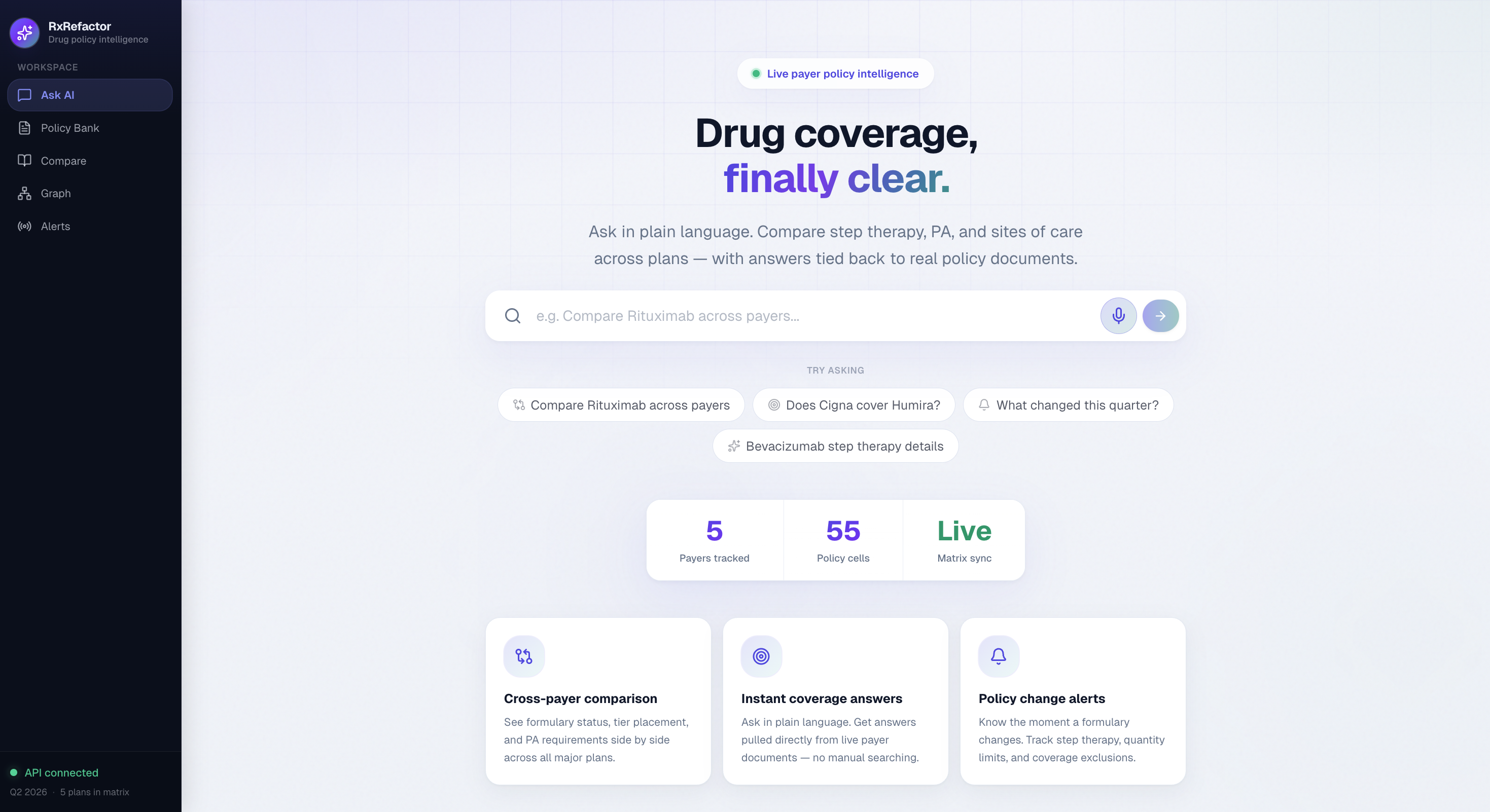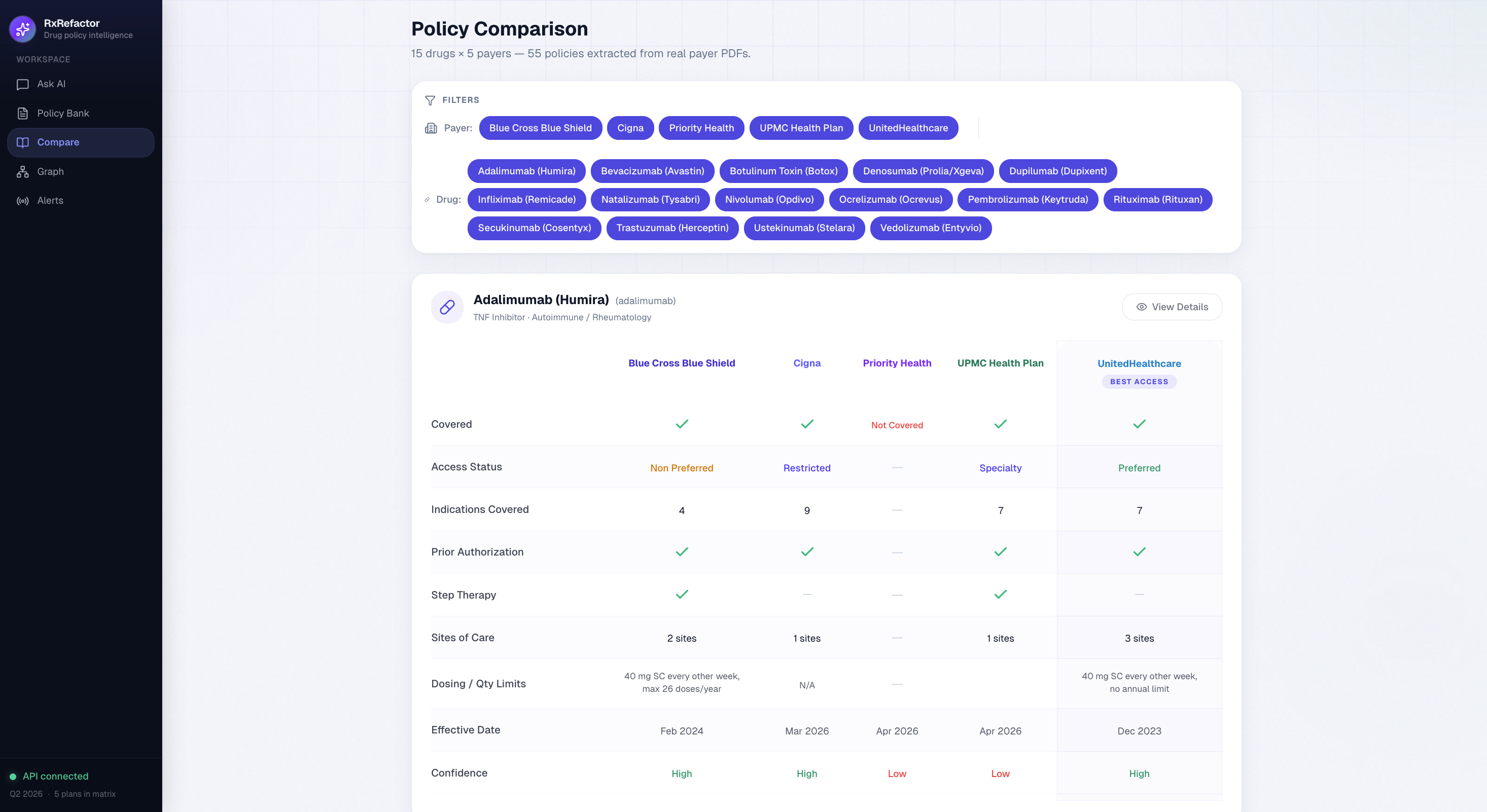 Healthcare in the US is notoriously fragmented. A physician prescribing a specialty drug, say, a biologic for Crohn's disease, has to manually dig through dozens of pages of insurance policy PDFs from BCBS, Cigna, UnitedHealthcare, and others, just to answer: "Will this drug be covered for my patient?" That process can take hours. Errors lead to claim denials, delayed treatment, and frustrated patients. We wanted to build a tool that collapses that research from hours to seconds.