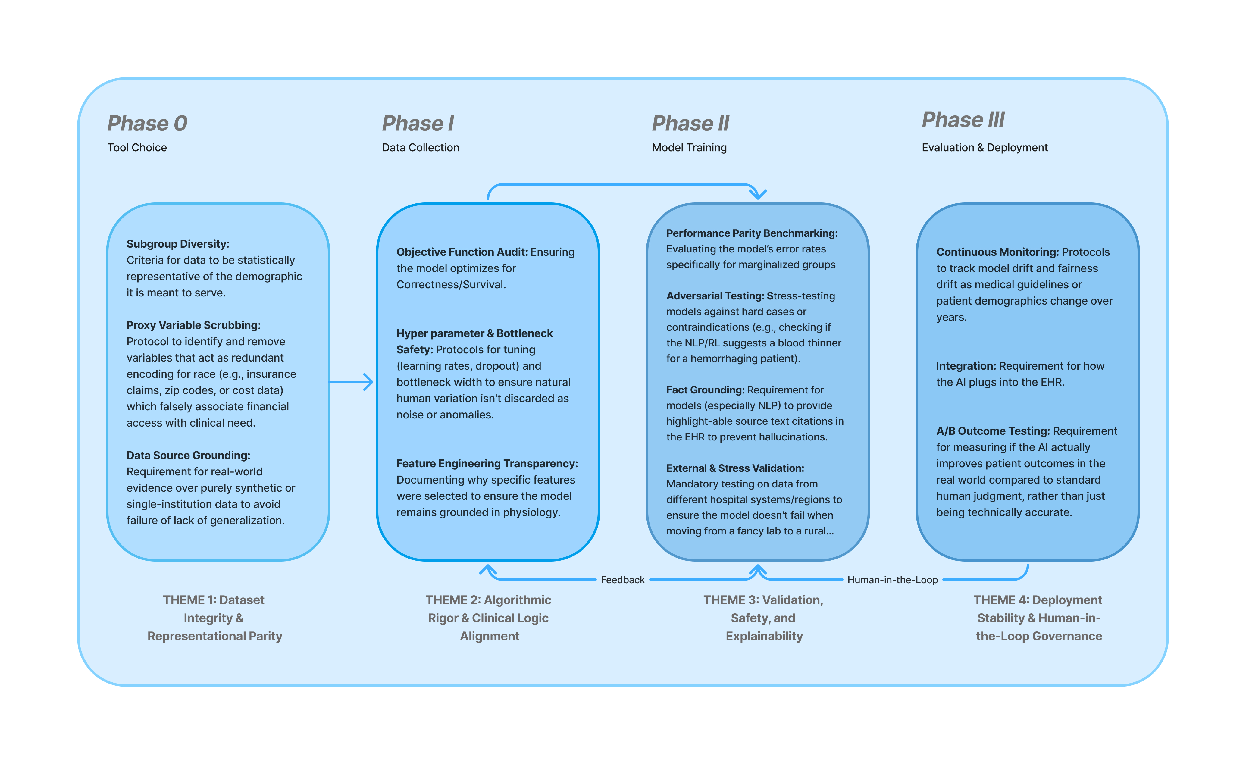 Evaluation Methodology & Metrics: S.H.I.E.L.D. structures evaluation into four phases: Tool Selection (matches AI learning modes to clinical use cases), Data Collection (diversity scores and label integrity audits), Model Training (shortcut detection via heatmaps ensuring causal feature learning), and Evaluation & Deployment (stratified auditing for calibration parity and external dataset stress tests).