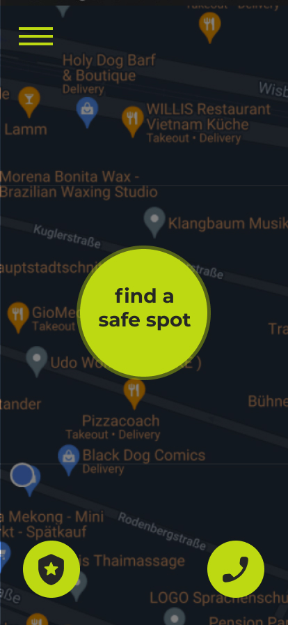 The intention is to provide quick safety in time of need; to quickly find and map a user to an open establishment. The simplicity of the app makes it possible for quick, reliable decisions to inform a user of possible safety.