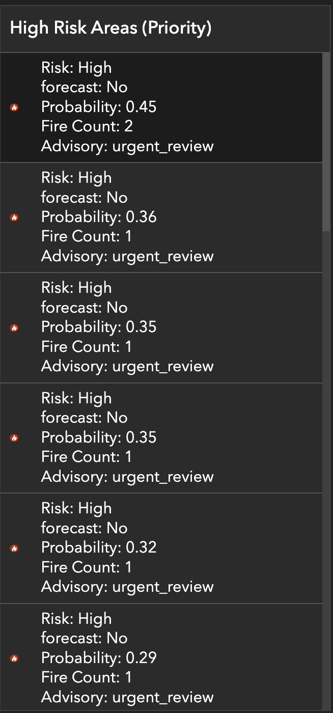 - Built an interactive dashboard showing risk zones, fire clusters, wind vectors, and a priority risk list