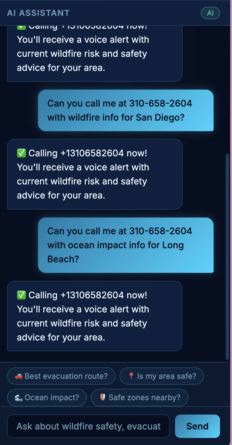 - Voice alert working live: say a phone number in the chat → get a real phone call with a safety briefing in seconds
