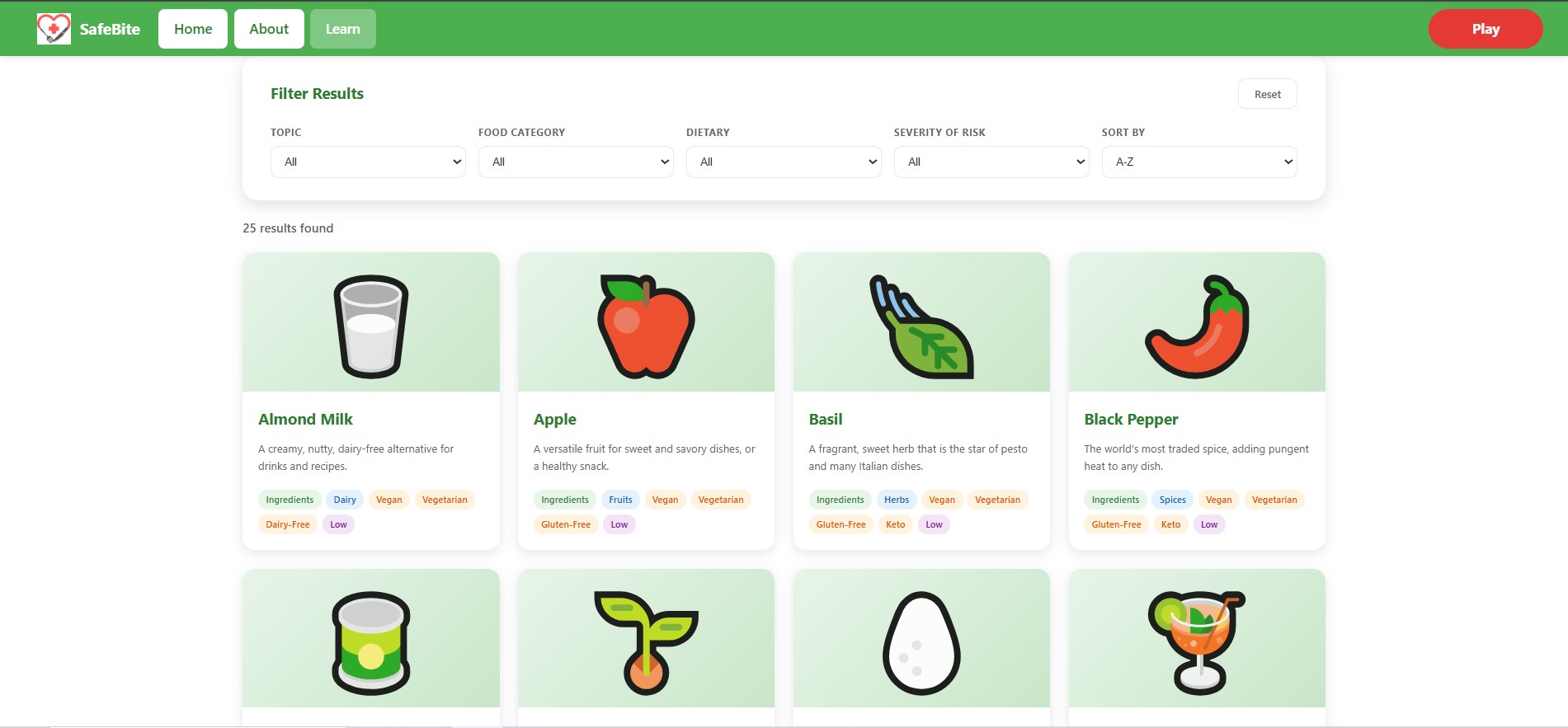 SafeBite is an interactive web platform designed to make food safety education accessible and engaging. It has two primary features: