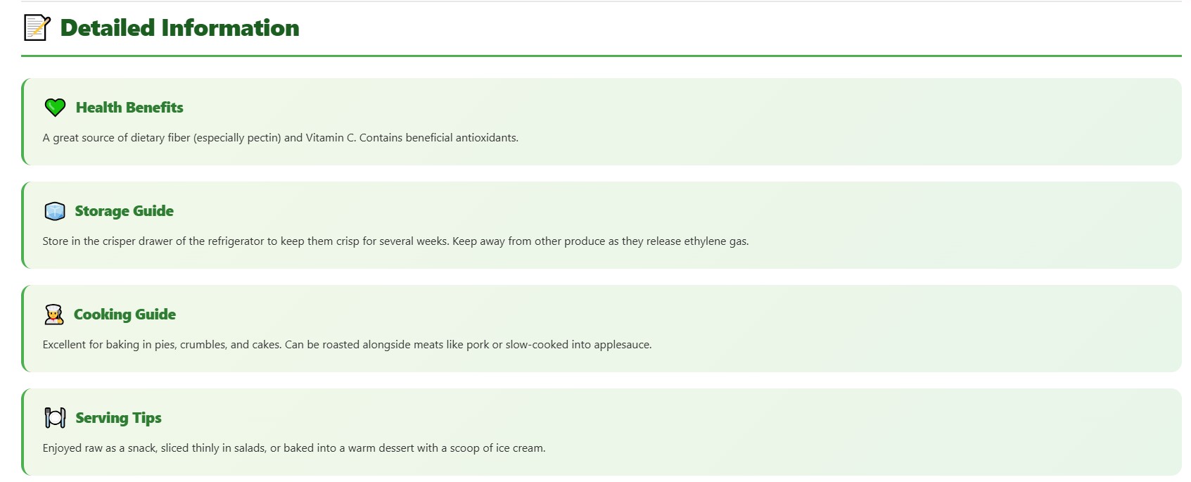 The Info/Learning Page: A comprehensive, searchable database of over 50+ common food items. Users can quickly find detailed information on 10+ critical data points, including proper defrosting, cooking temperatures, and preservation methods.