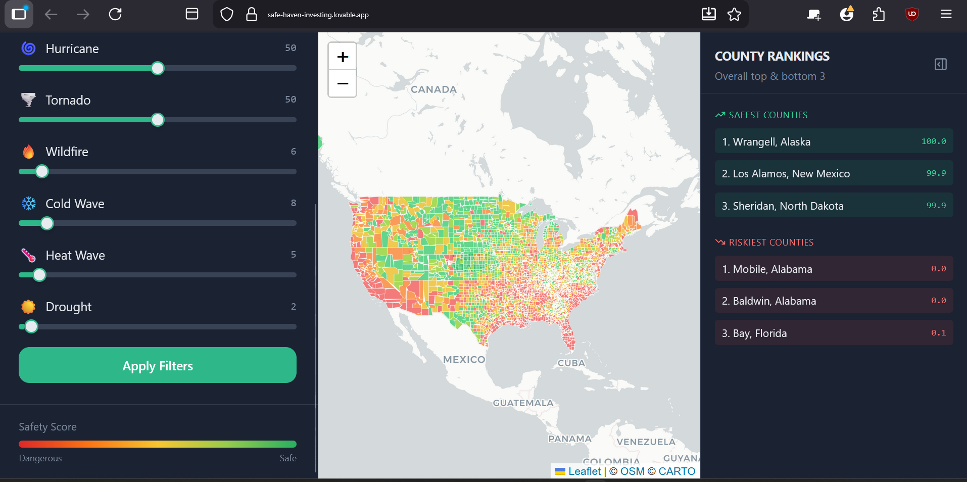 The frontend UI takes in input sliders from the user and adjusts the risk calculations based upon the user's preferences. For example, if the user is okay with earthquake risk, they set it to zero, and places with higher earthquake risk have overall more improved scores.