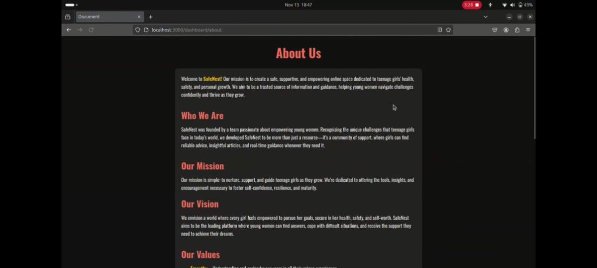 SafeNest aims to grow into a comprehensive platform that empowers teenage girls with both the resources and support they need to navigate their personal journeys safely and confidently.