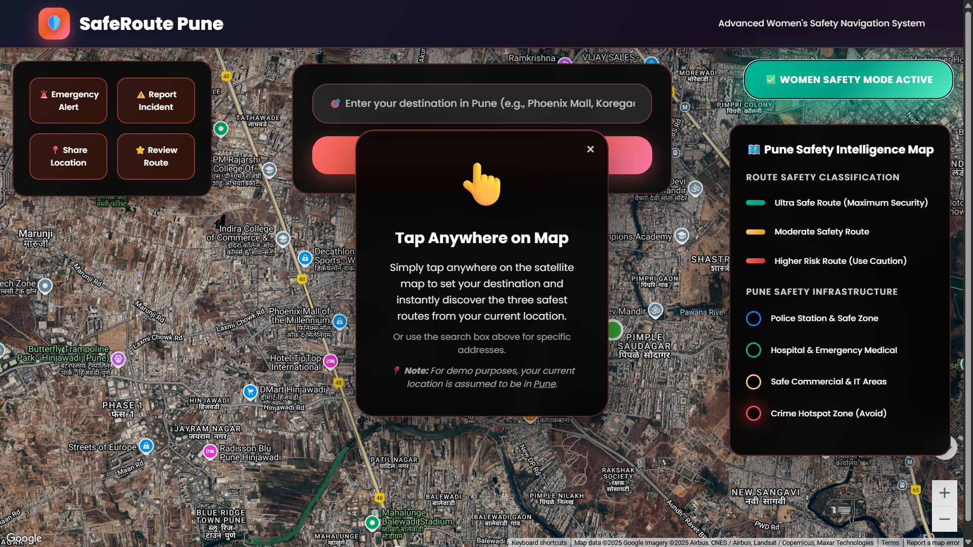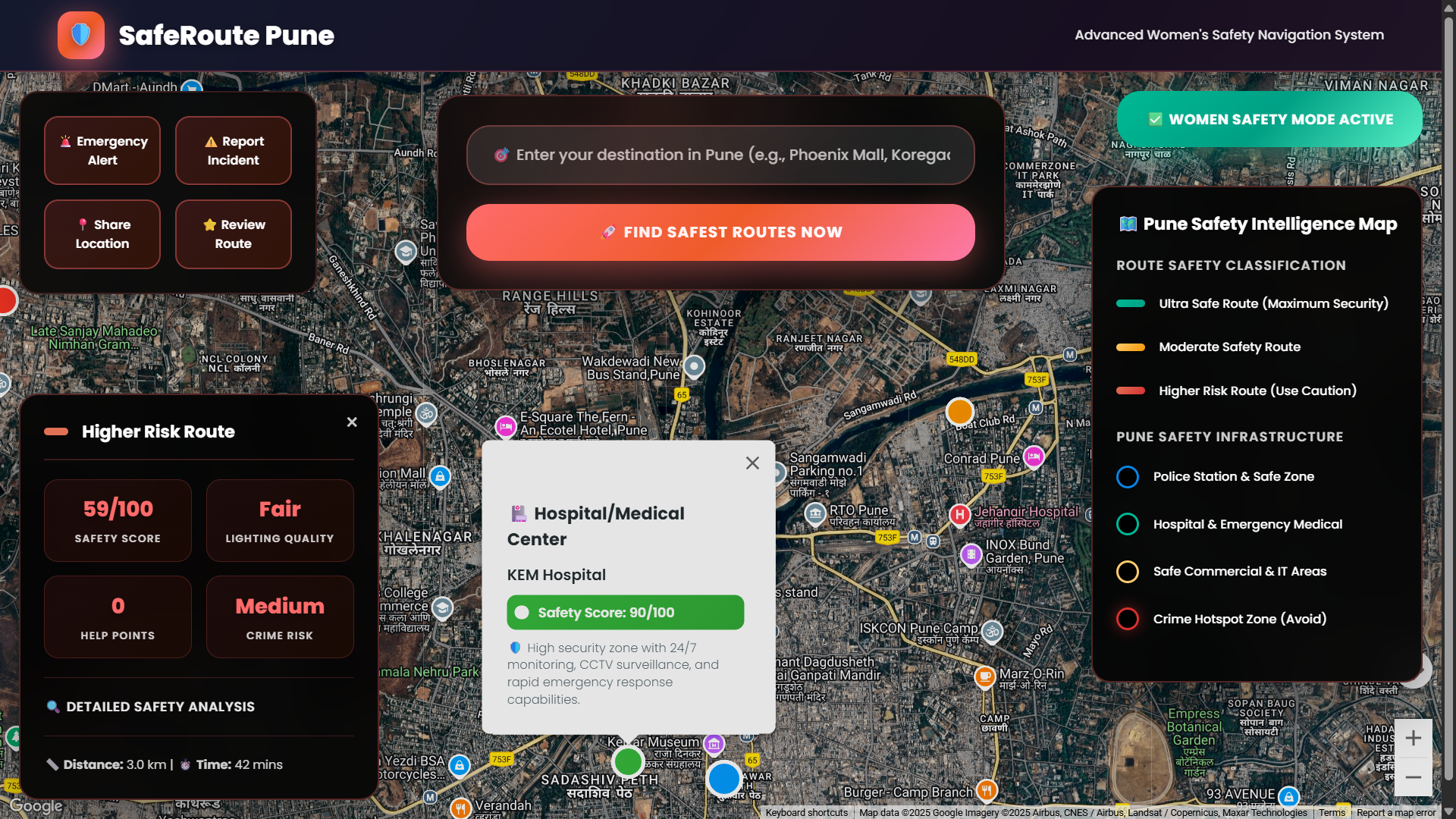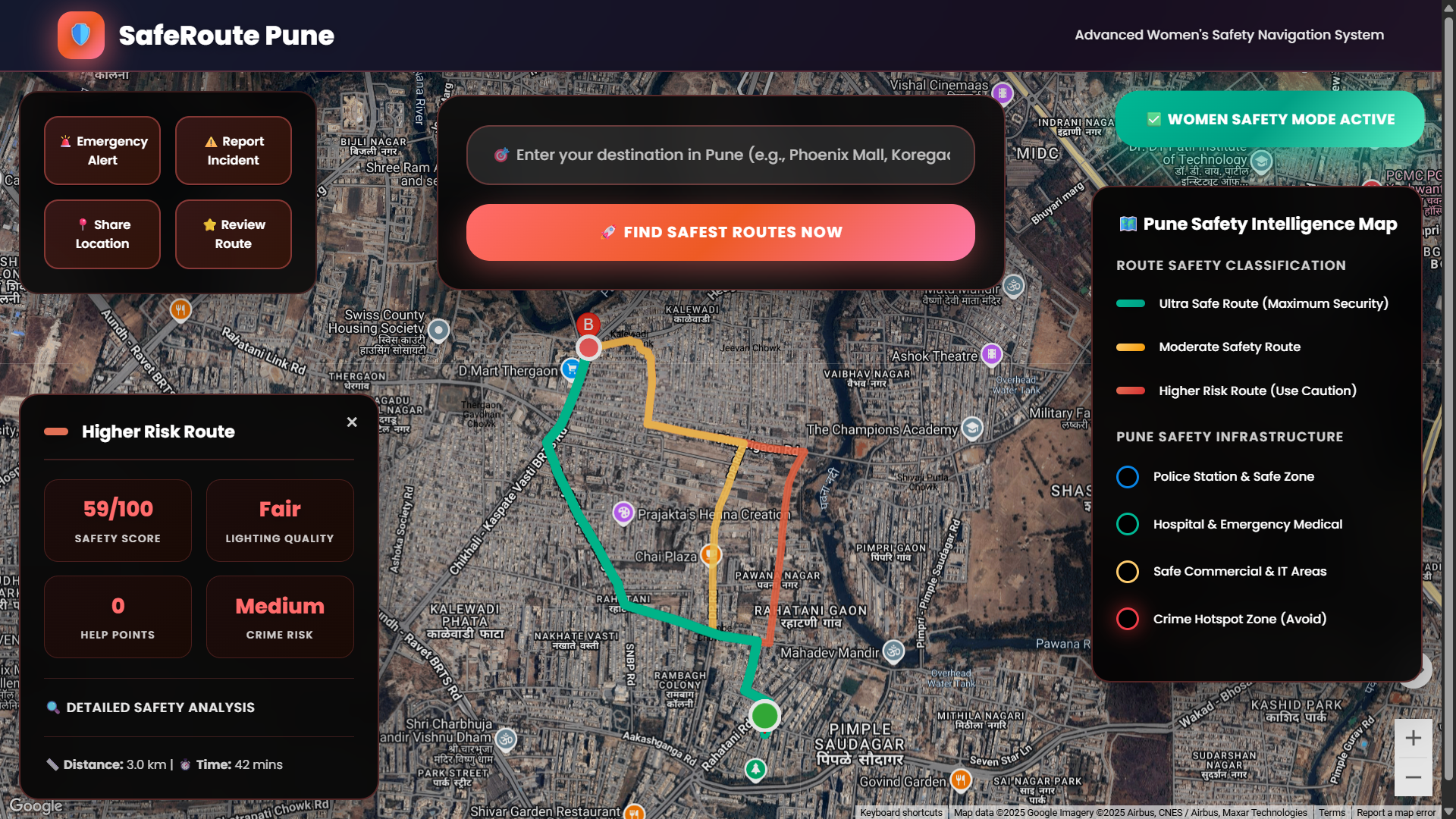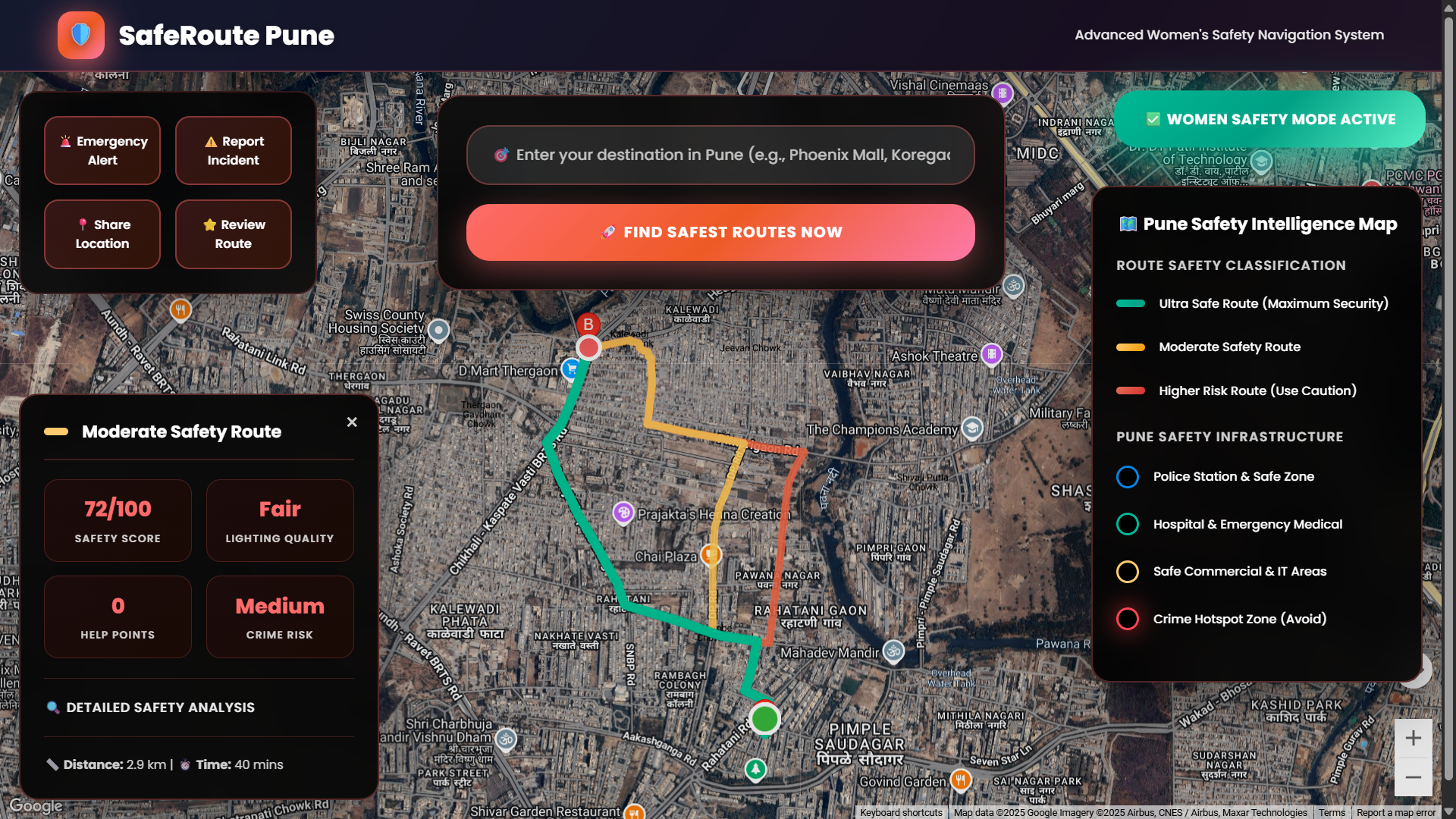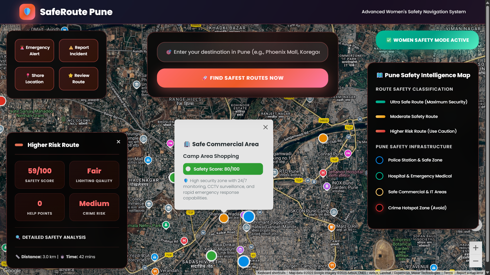 That’s when SafeRoute Pune was born — a navigation system that empowers women to make informed, safety-first travel decisions.