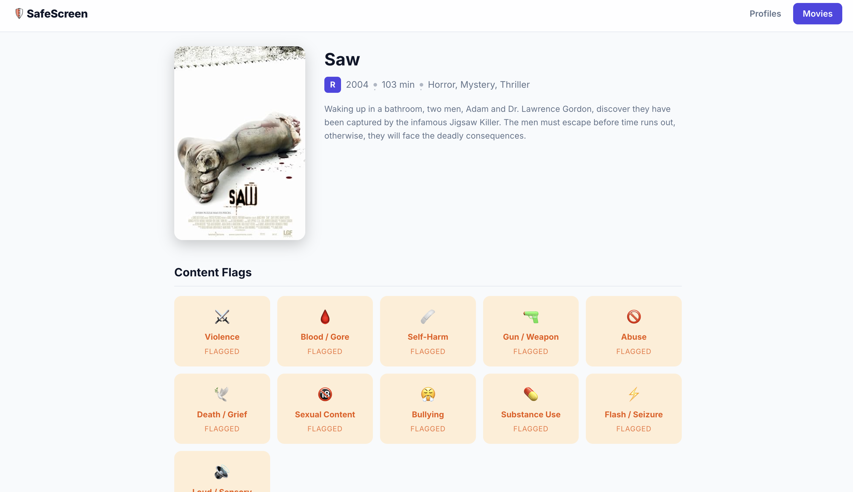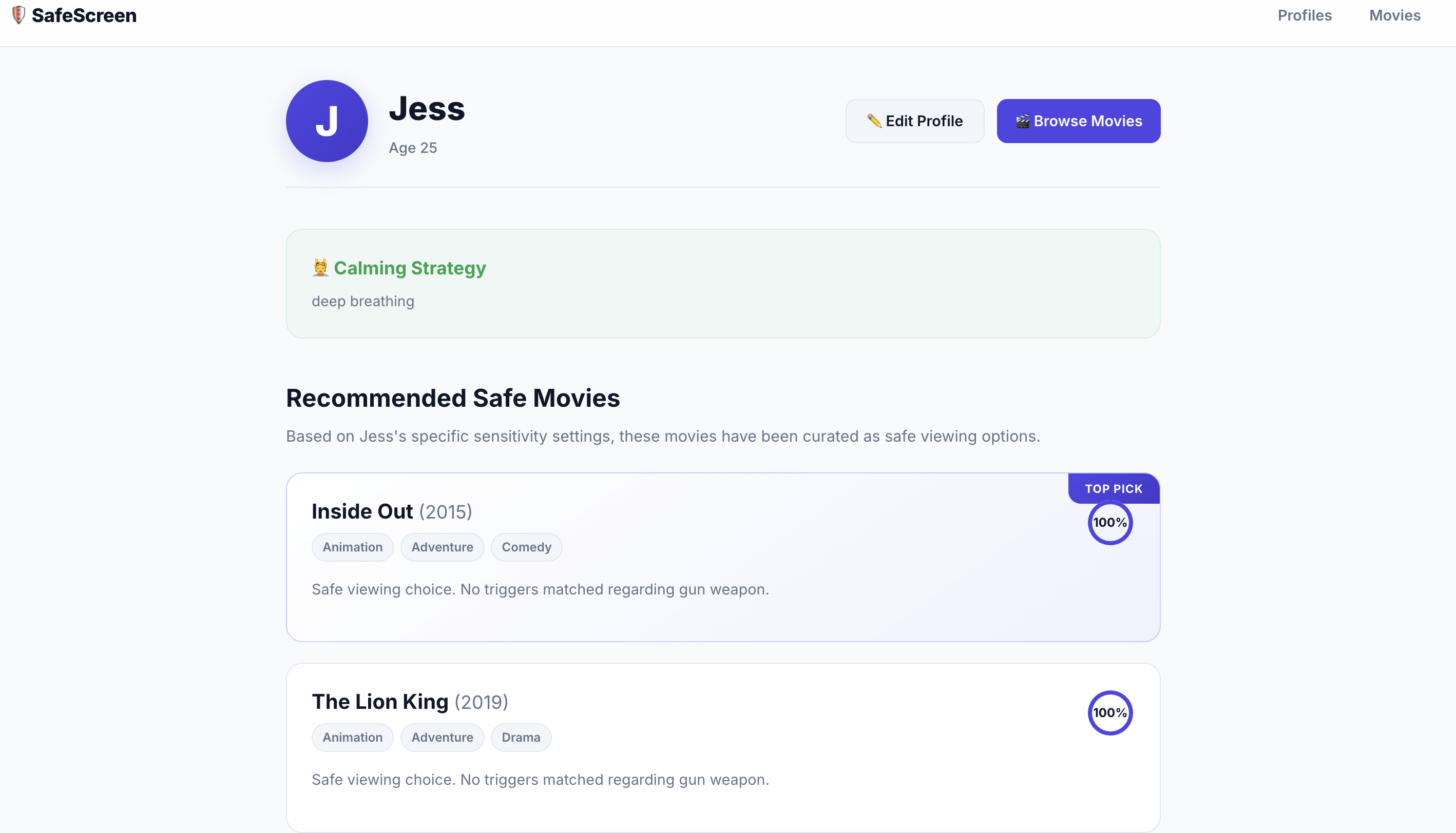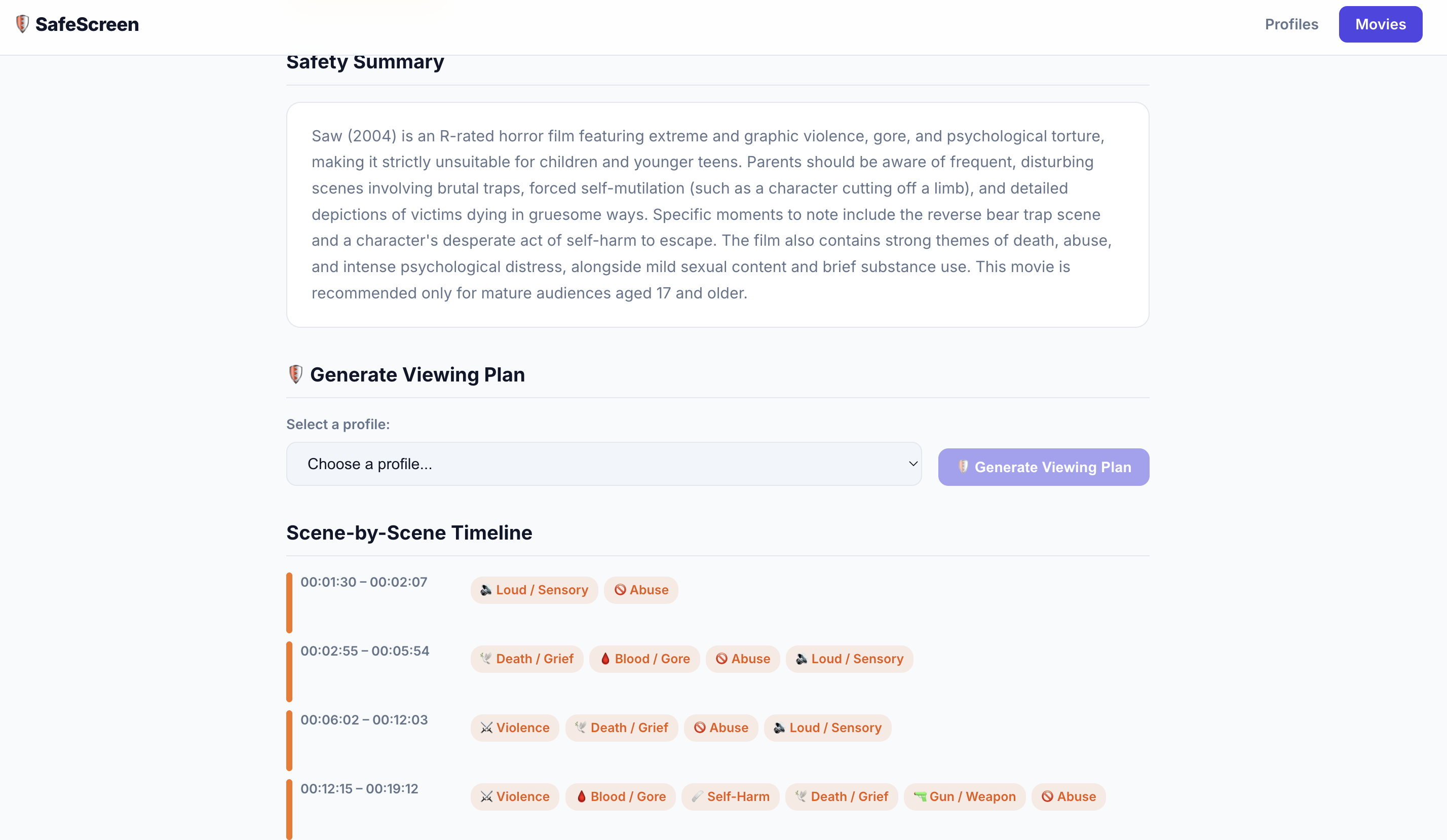 - The Nuance of Media Safety: We learned that "safety" isn't binary. A massive learning curve was understanding how to implement calming strategies and decompression metrics. Fast-forwarding a scary scene isn't enough; sometimes the viewer just needs a 5-minute break with a box-breathing exercise before continuing. ## What's Next for SafeScreen Currently, SafeScreen works on pre-analyzed transcripts. Our next major step is building a browser extension that directly hooks into streaming platforms (like Netflix or Disney+). By intercepting the video player, we can automatically execute the SafeScreen viewing plan muting the audio, applying CSS blur overlays, or pausing the video at the exact timestamps our API generated, creating a completely zero-touch parental control experience.