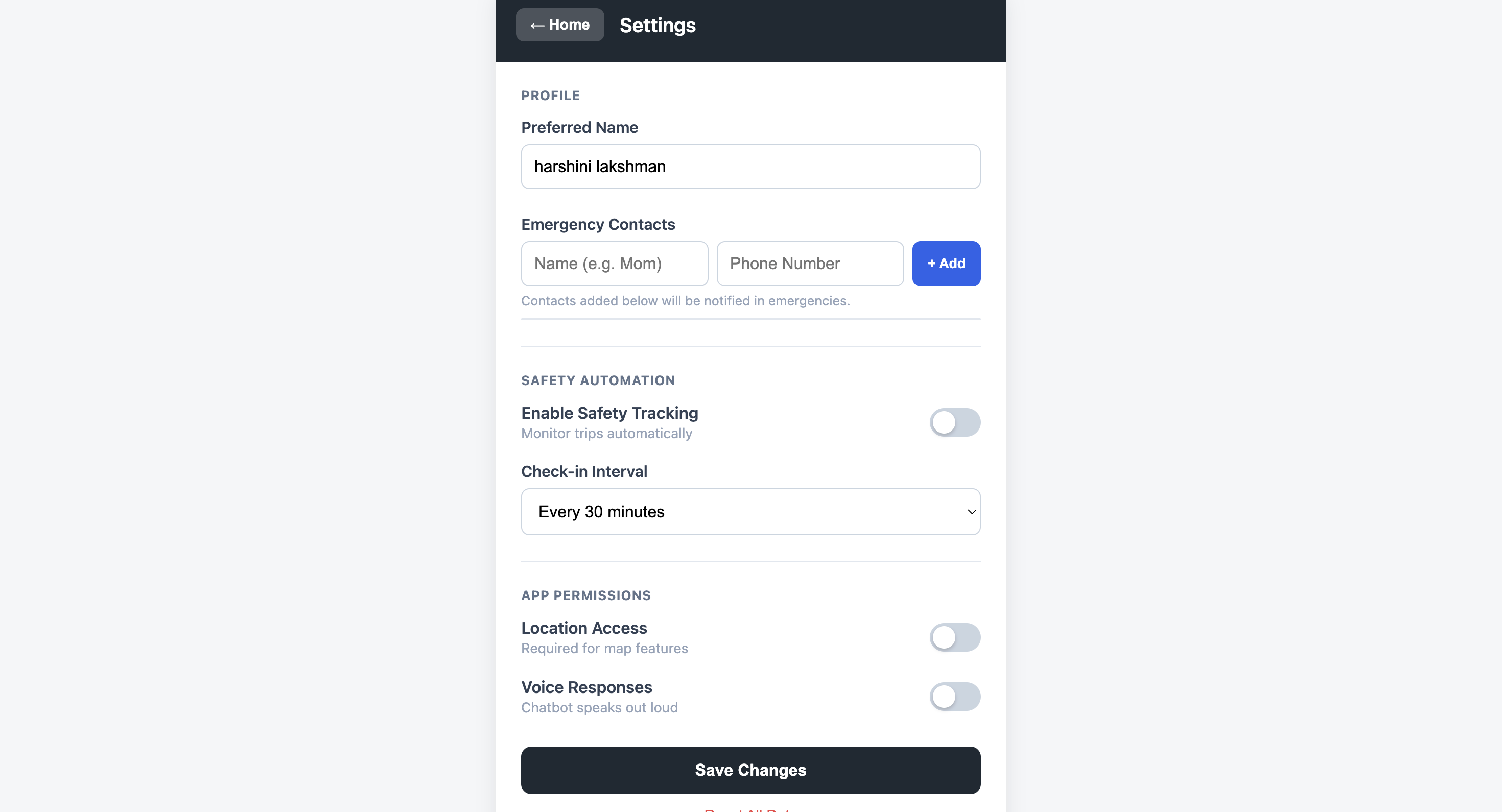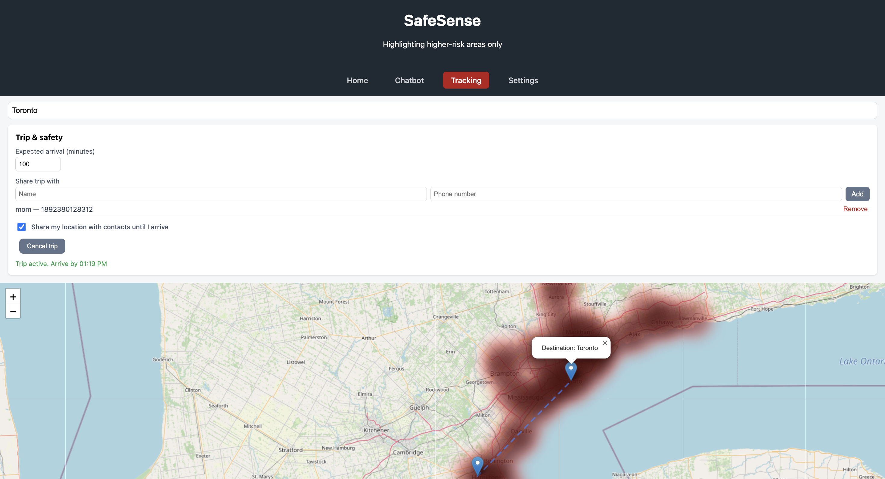 The main features includes a live location tracking map that ensures that the user gets to the designated location within the timeframe that the user sets. They can visually see higher-risk areas on the map and send location/alerts to emergency contacts that the user can set within the application. The second main feature is the safety chatbot that answers questions that the user may have live, without having to wait for an operator or someone to answer the phone.