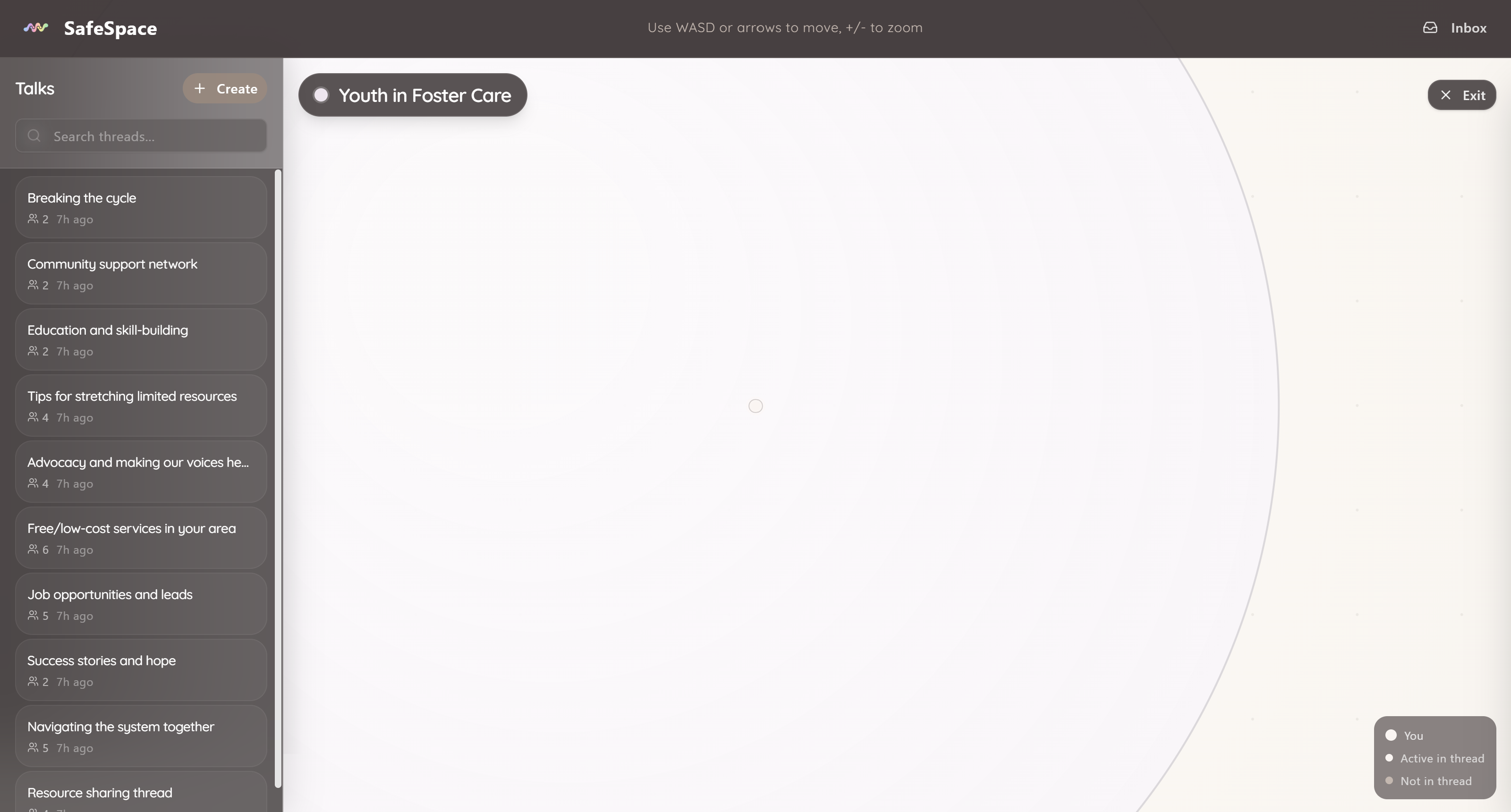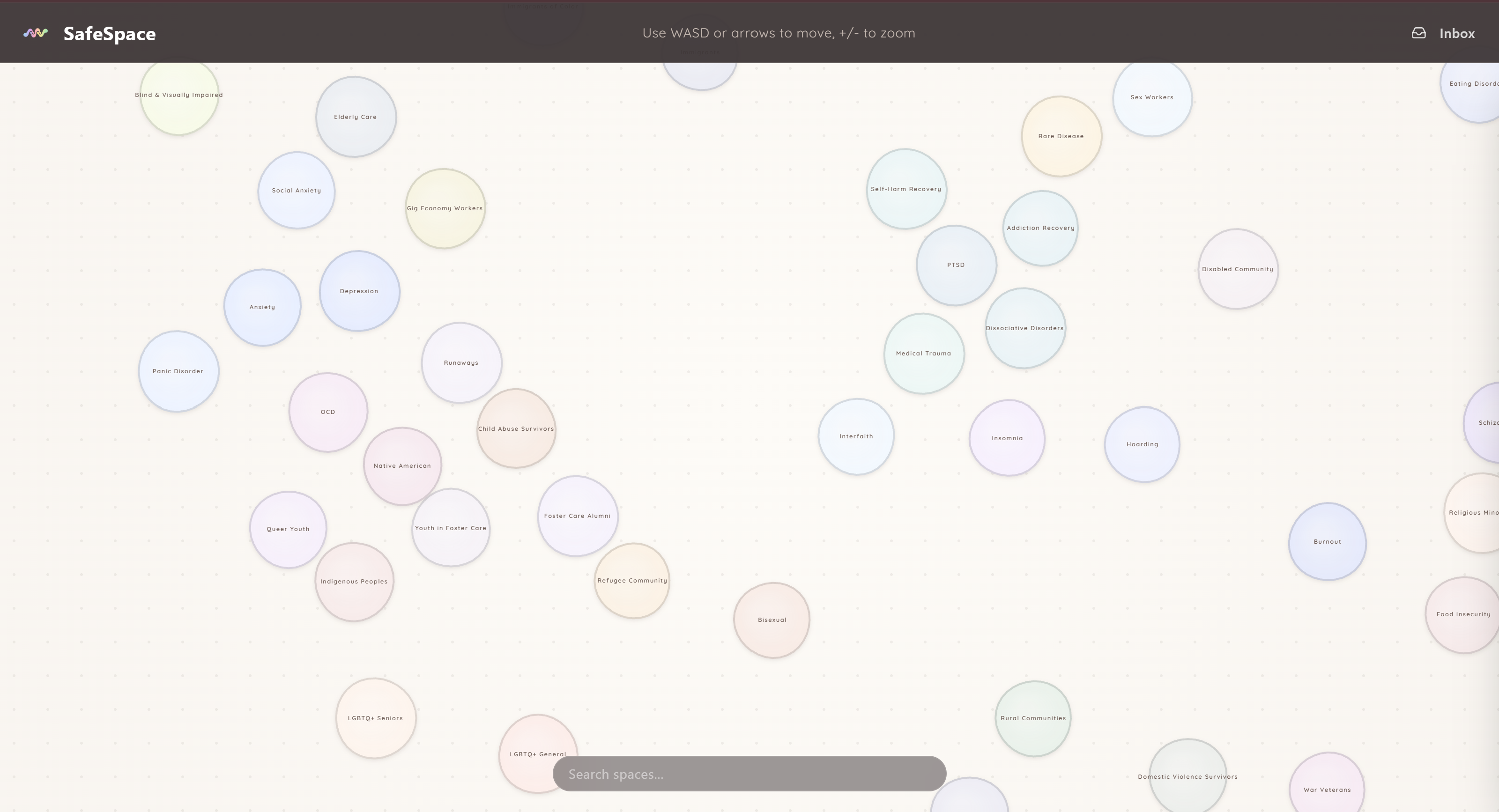 SafeSpace is an unconventional social support network made to cover the gap that fails to address these challenges. By navigating topics (Spaces) users can click on interactive bubbles to see what threads exist inside the Space. Each thread is anonymous, no names, no judgment, no bias. Users can choose to share their name and contact individuals inside their thread to ask further questions or help others out privately.