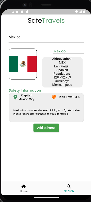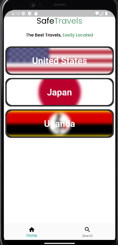 This project was made for UGA Hacks 8. Safe Travels assists travelers in planning a secure vacation that minimizes risk of encountering different levels of crime by providing information on searched countries. Each country provides a language, population count, capital, currency, etc. After searching, countries can be added to the home page for future access. Clicking on the countries in the home page will take you back to their searched information pages.