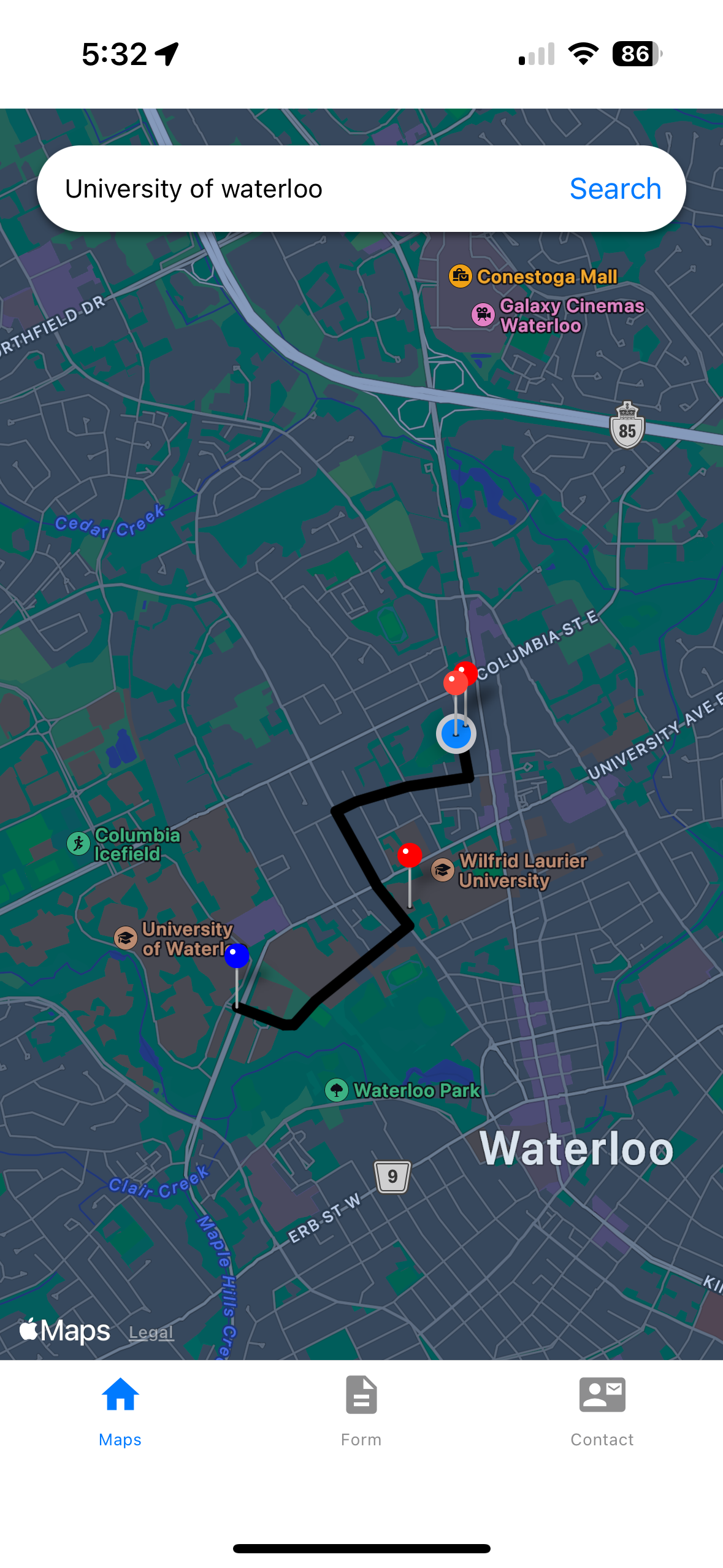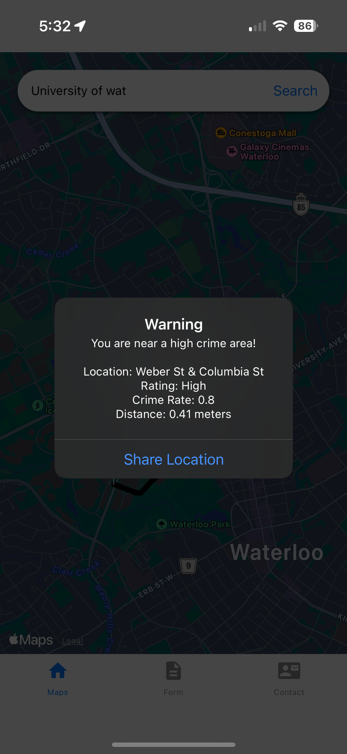 SafeTrip is inspired by the need for safer KW experiences. As KW becomes busier and more populated, concerns about personal safety, especially in high-crime areas, have risen significantly. We wanted to create a solution that empowers women to make informed decisions about their routes and destinations by providing real-time crime data.