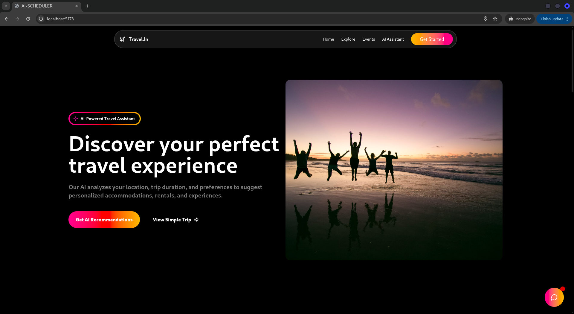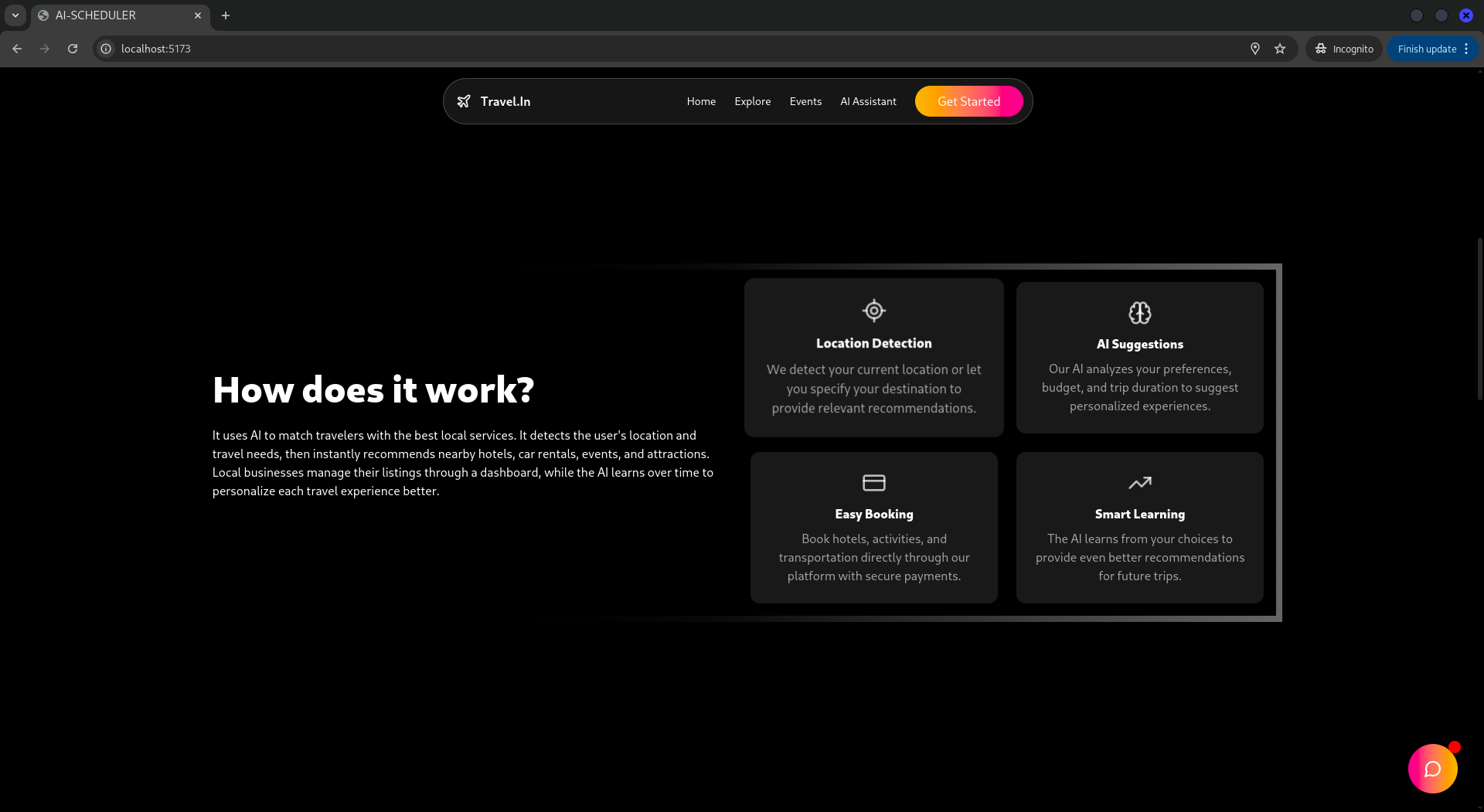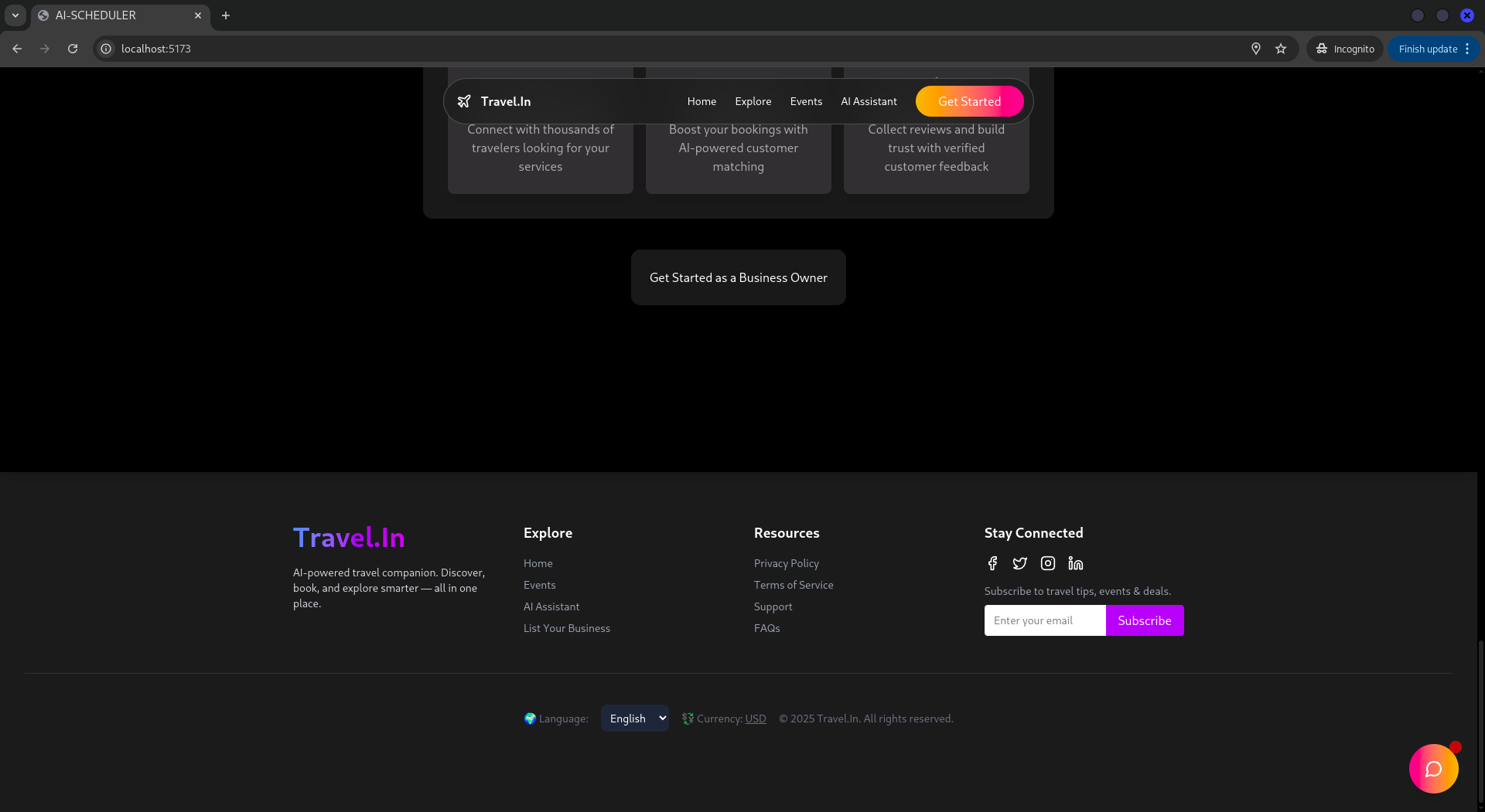 Travel.In is an AI-powered travel assistant platform that helps users discover hotels, rent cars, find local guides, and attend nearby events—all based on their current location, future destination, and personal interests. For small business owners (like hotel managers or tour operators), the platform offers a custom dashboard to list and manage their services. Travelers simply input or let the app detect where they are, and the AI recommends the most relevant experiences, bookings, and routes in real time.