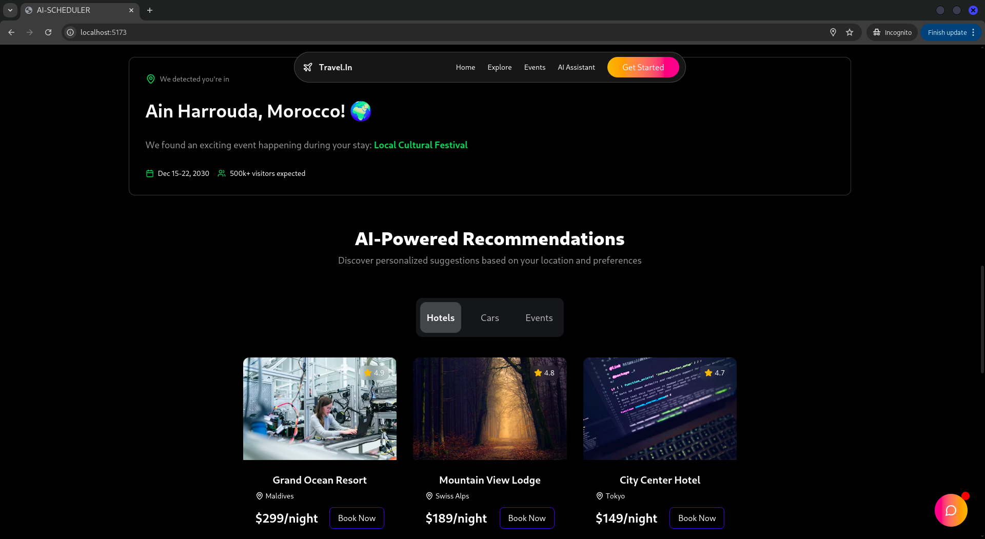 A live prototype that dynamically recommends events, hotels, and car rentals. A working AI assistant bubble that interacts with users and offers suggestions based on behavior. A responsive, clean design that feels like a modern travel companion. Successfully onboarded mock data for local Marrakesh-based businesses and events.
