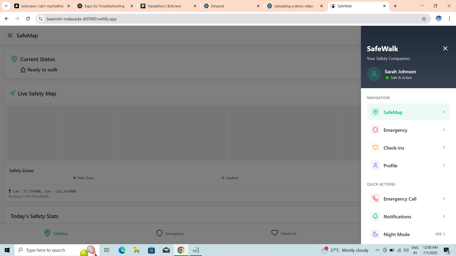 Walking alone at night, especially in unfamiliar or poorly lit areas, can be unsettling—particularly for women and students. I’ve often found myself holding my phone tightly, sharing my live location with friends, or walking fast in fear. This constant anxiety inspired me to build Safe Walk — a smart, AI-powered mobile companion that ensures you’re never truly alone on your way home.