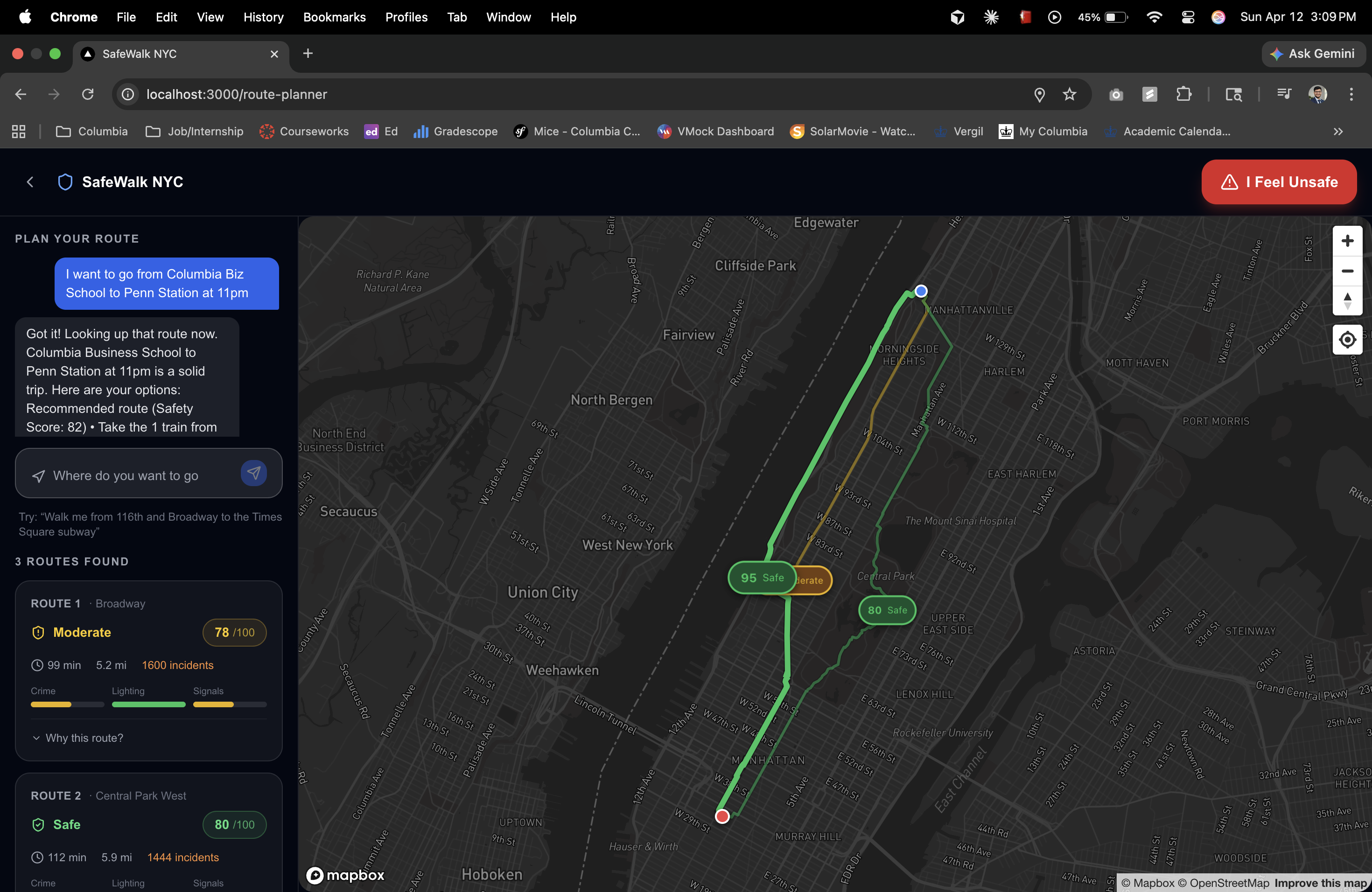 Displays color-coded routes on a dark Mapbox map — green for safe, amber for caution, red for risky Explains the recommendation in plain English via Claude: "I'm routing you via Broadway instead of Amsterdam — Broadway has active storefronts open until midnight and two signalized intersections. Amsterdam has two open 311 streetlight complaints and one reported incident in the last 30 days." Routes emergency alerts based on your university email — Columbia students get one-tap calling to Campus Public Safety (212-854-5555), NYU students get NYU Campus Safety (212-998-2222) plus Safe Ride booking during late-night hours