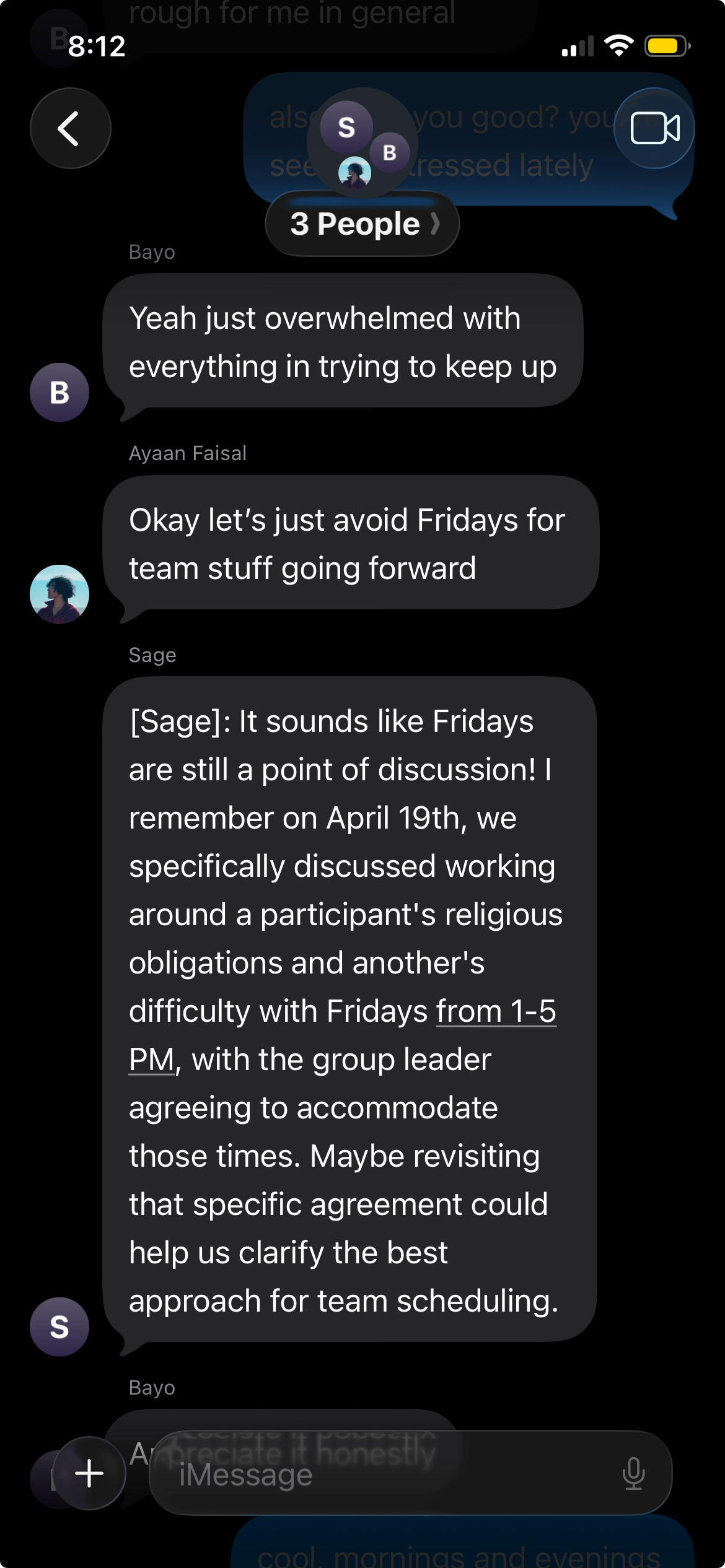 Sage is an AI agent that lives inside your group chat as a persistent participant. It listens continuously, builds memory of what each member has said over time, and intervenes selectively when the group is stuck, drifting, or about to contradict something it has already decided/ignore the considerations someone else posited regarding their personal concerns in a decision. Every intervention is grounded in retrieval from the chat's actual history--never generated from scratch. When Sage surfaces someone's prior scheduling constraint, it's because they said it, not because Sage inferred it. This makes contributions feel earned rather than hallucinated. Sage operates across two surfaces with shared memory: the group chat (public, collective) and private DMs (for sensitive context that shouldn't be surfaced publicly or for extra context in case someone thinks the agent should know something they don't want to say in public). Both run natively on iMessage via Photon's Spectrum framework. Members can also @ Sage directly to ask follow-up questions--the same gesture you'd use to call a friend's name across the room or to get someones attention in a group chat.