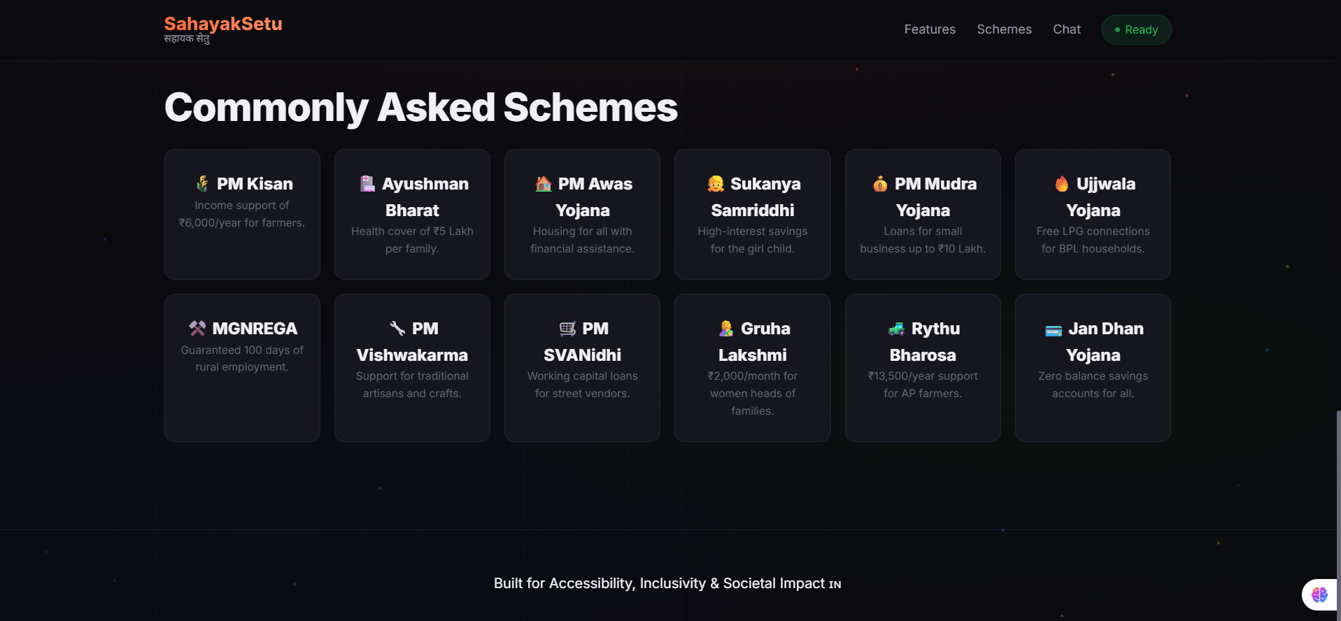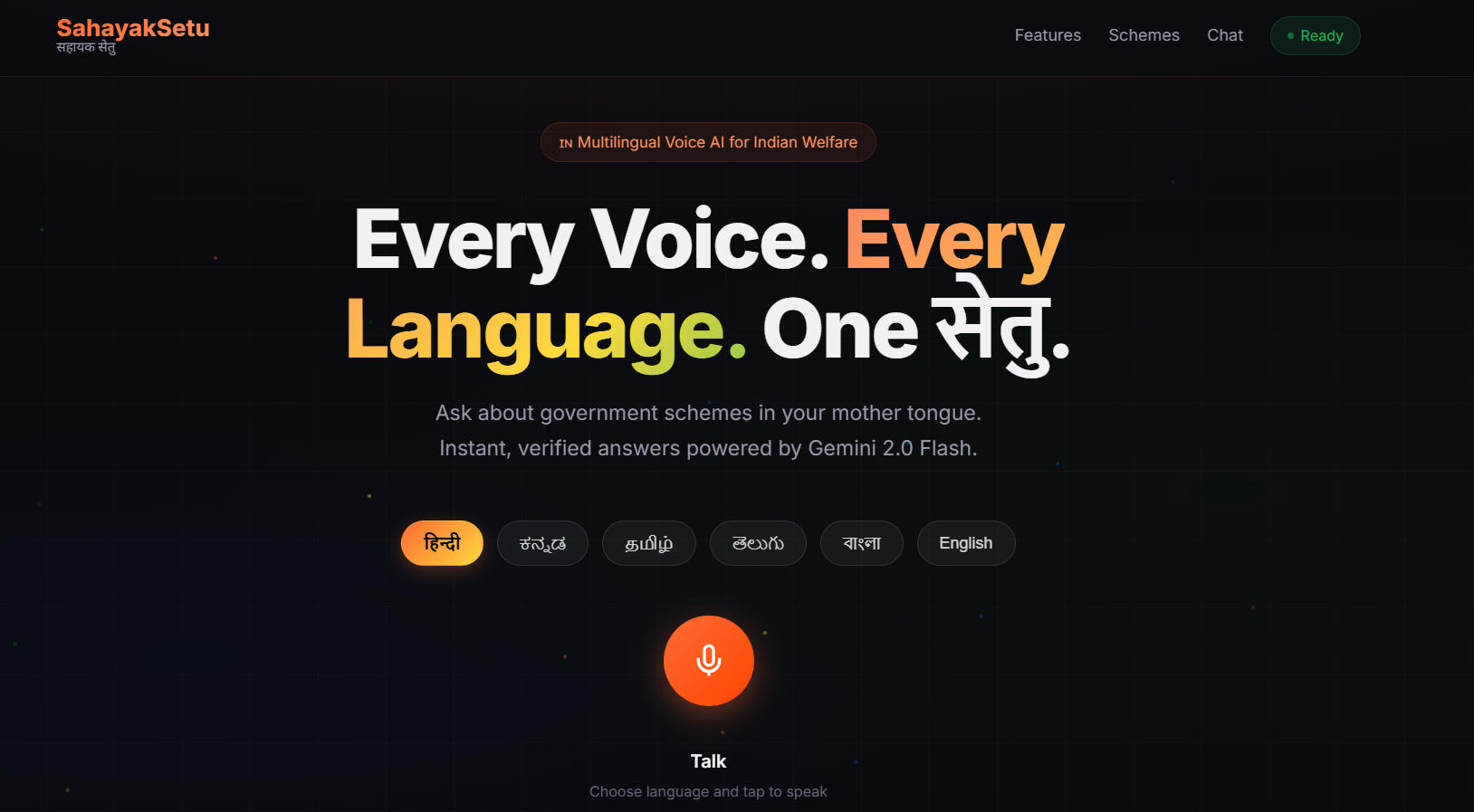 SahayakSetu is a voice-first digital assistant that helps senior citizens understand and access government schemes easily.