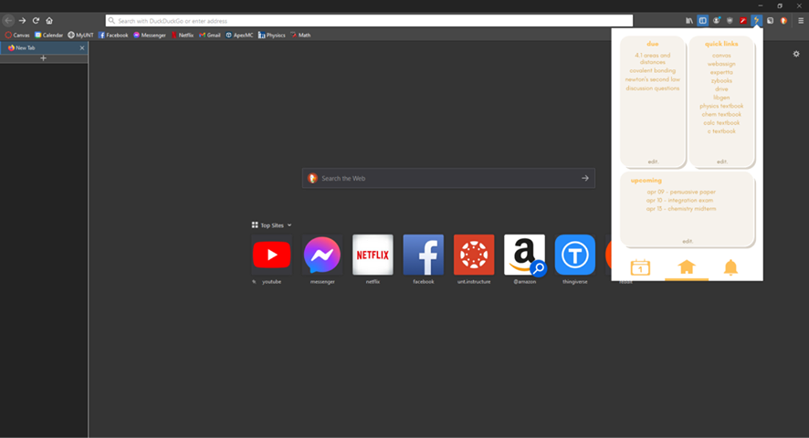 Based on the Canvas API, this website will contain a calendar that holds all due dates and upcoming exams as well as other important events. The extension will provide a simplified view containing the assignments due that day, upcoming exams/projects, and quick links for textbooks and other useful tools.