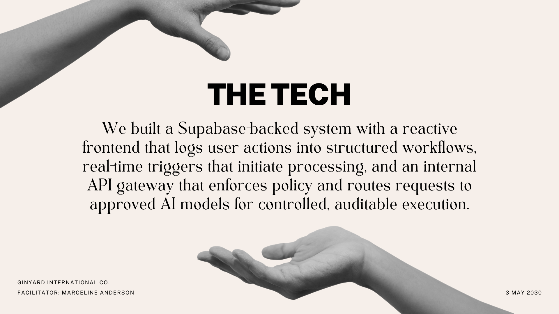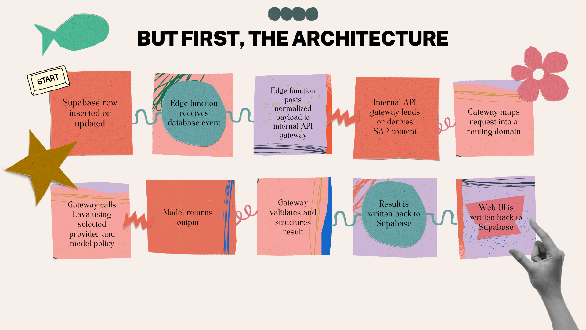 A user triggers an action The system records the request The request is classified Guardrails are applied The model generates output A human reviews if required The workflow completes safely Architecture Supabase — System of record