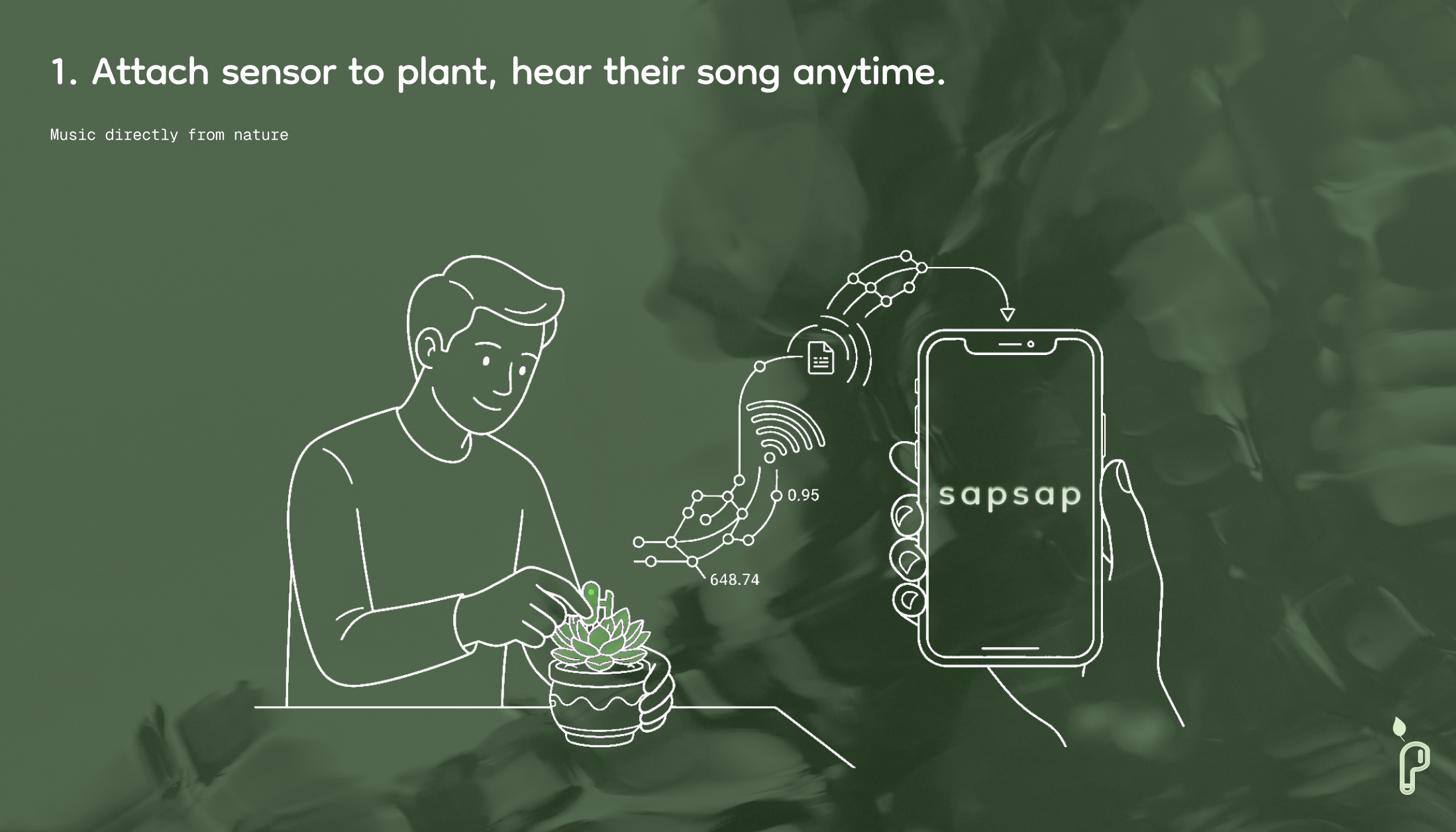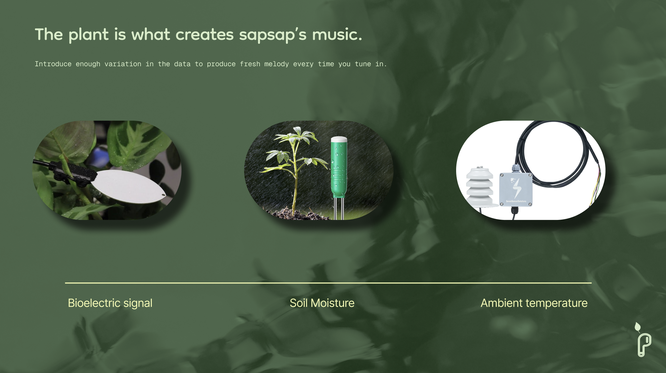 sapsap is a system that translates the invisible bio-electrical pulses of both indoor houseplants and outdoor flora into real-time ambient music. The system captures micro-variations in electrical resistance caused by the plant's soil moisture, temperature and soil pH.