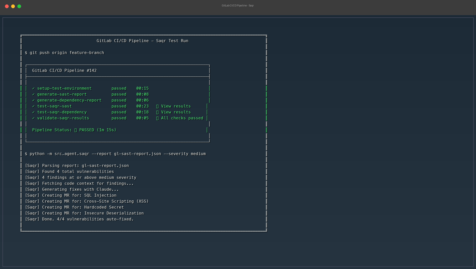 When GitLab security scans (SAST, Dependency Scanning, Secret Detection) complete in a CI/CD pipeline, Saqr automatically: