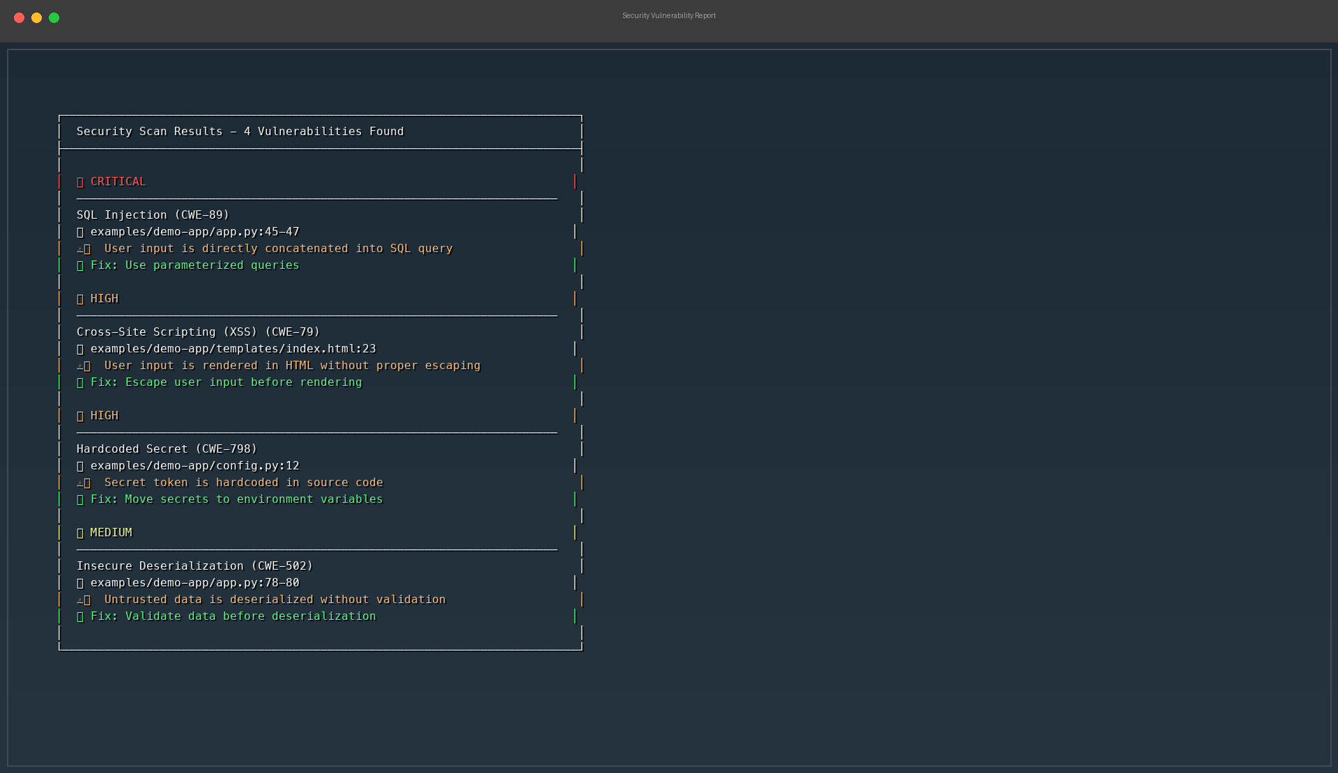 - Generates a precise, minimal fix using Claude — targeting only the vulnerable lines without refactoring unrelated code
