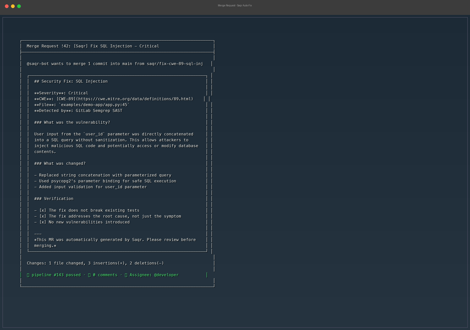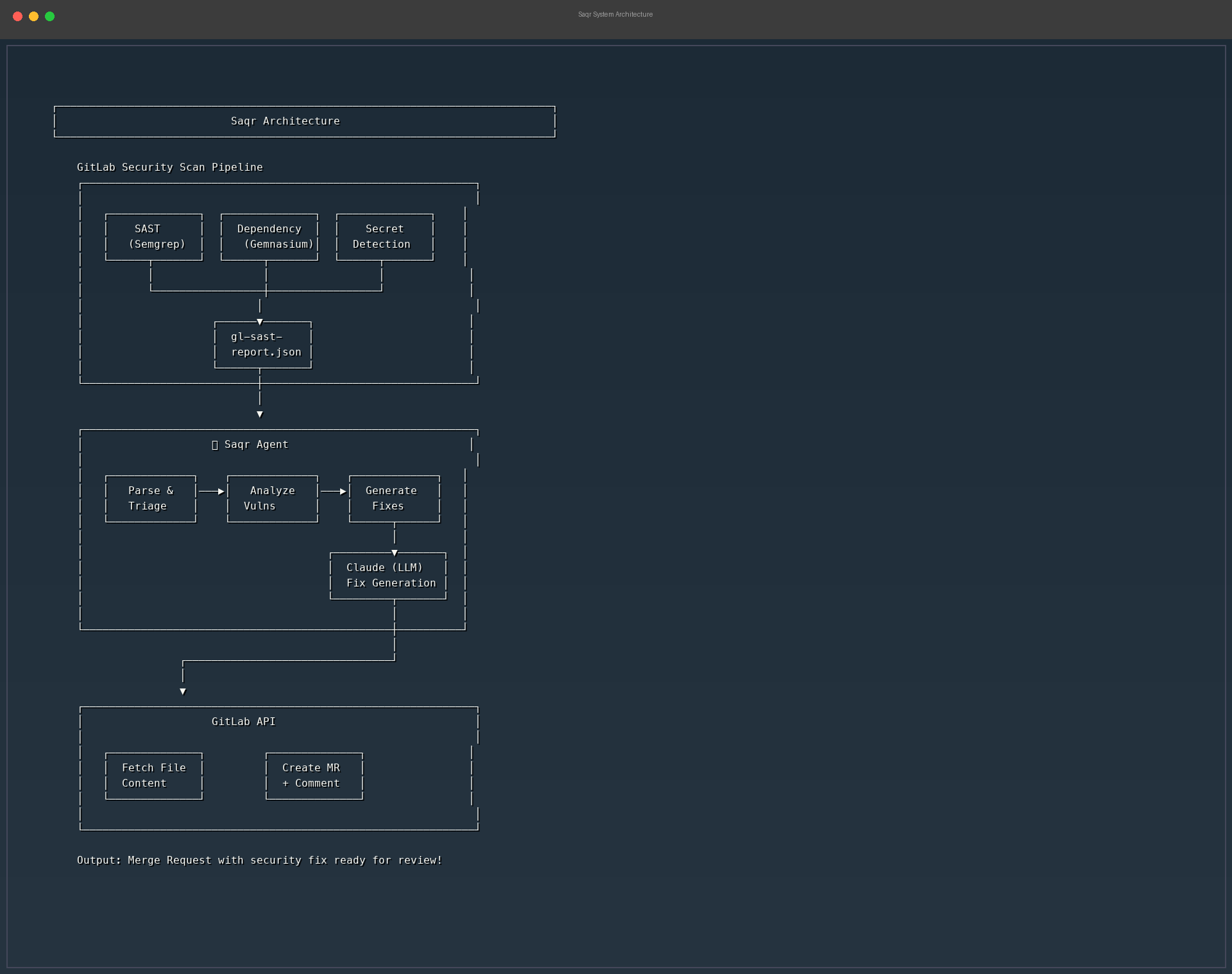 - Falls back gracefully — if a vulnerability requires human judgment (architectural flaw, missing business context), Saqr creates a GitLab Issue with detailed remediation guidance instead of a broken MR