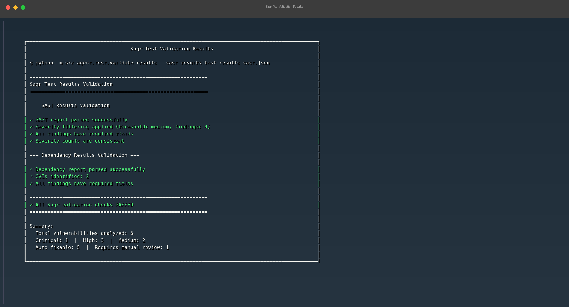 - Saqr correctly identifies unfixable vulnerabilities and creates actionable issues instead of broken PRs