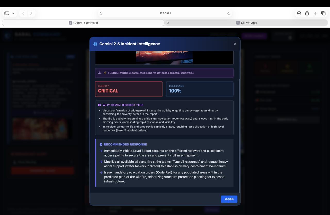 SARAL (Smart AI-driven Response & Action Layer) transforms raw emergency reports into clear, actionable intelligence. Citizens can send SOS alerts, images, and hazard reports. Gemini analyzes multimodal inputs to classify incidents, assess severity, and recommend response actions. Authorities view everything on a real-time command dashboard with maps, triage, and AI insights.
