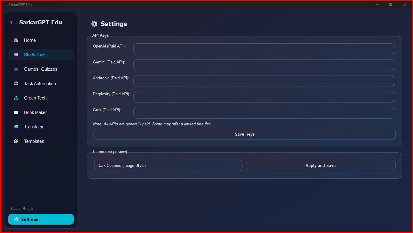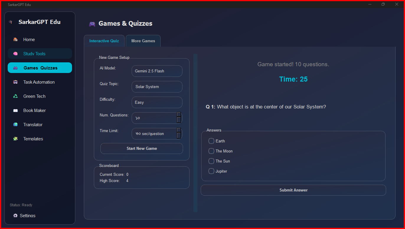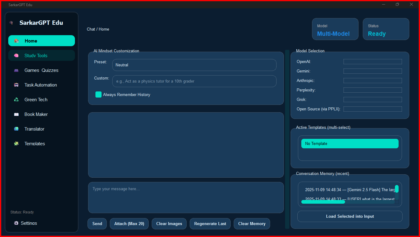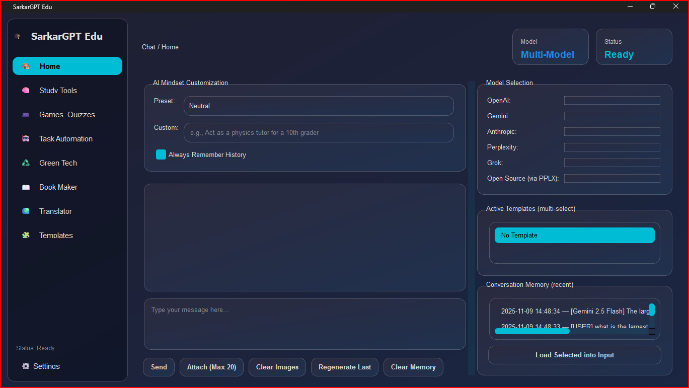 I was inspired to build SarkarGPT Edu because I wanted to create a centralized, powerful learning hub that went beyond a simple chatbot. While web-based AI tools are great, I wanted a persistent desktop application that could not only compare outputs from different AI models (like OpenAI, Google, and Anthropic) side-by-side but also use that AI to power specific, task-oriented educational tools. Instead of just asking an AI to make a quiz, I wanted a tool that would generate the quiz and then let me play it right away