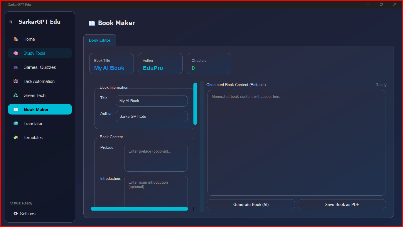 Writes E-books: The "Book Maker" tool uses AI to write a complete, multi-chapter e-book on any subject, which can then be saved as a PDF, complete with a title page and headers.