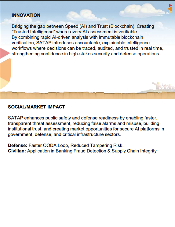 The “Trust Wrapper”: Successfully combining AI and blockchain to create a compact yet fully verifiable intelligence system Performance: Achieved end-to-end threat assessment in ≤ 5 seconds, meeting real-world operational constraints Cross-Domain Integration: Delivered a single solution spanning Defence Systems, AI/ML, Web3, and Cybersecurity